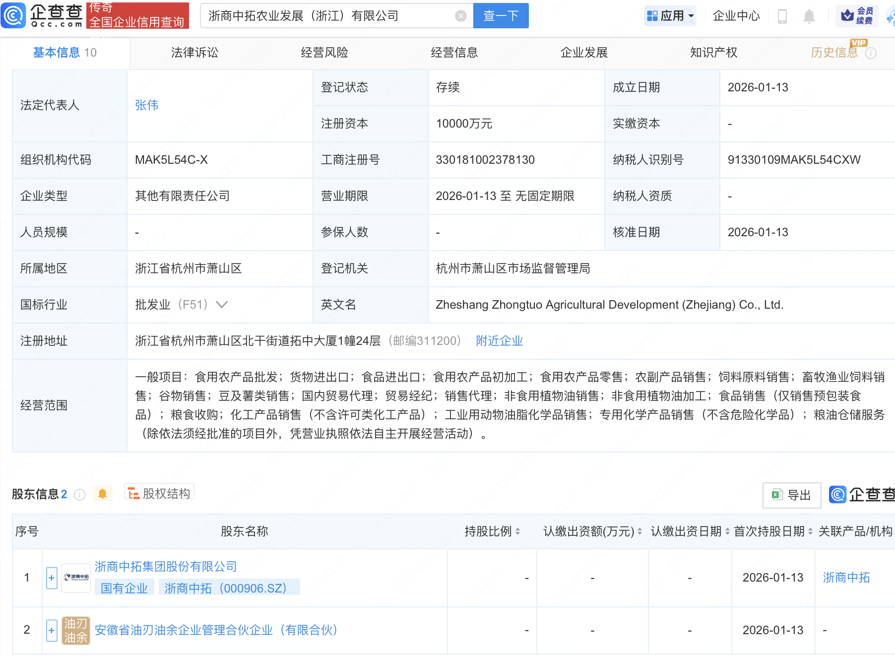 企查查APP显示,近日,浙商中拓农业发展(浙江)有限公司成立,注册资本1亿元,经营范围包含:食用农产品批发;货物进出口;食品进出口;食用农产品初加工等。企查查股权穿透显示,该公司由浙商中拓(000906)等共同持股。