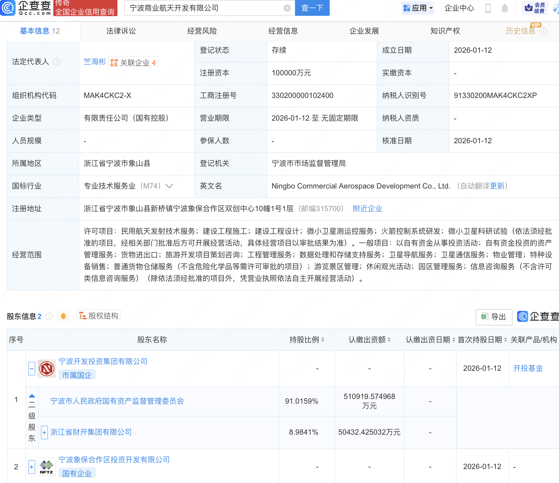 企查查APP显示,近日,宁波商业航天开发有限公司成立,注册资本10亿元,经营范围包含:民用航天发射技术服务;火箭控制系统研发;微小卫星科研试验;卫星导航服务等。企查查股权穿透显示,该公司由宁波开发投资集团有限公司、宁波象保合作区投资开发有限公司共同持股。
