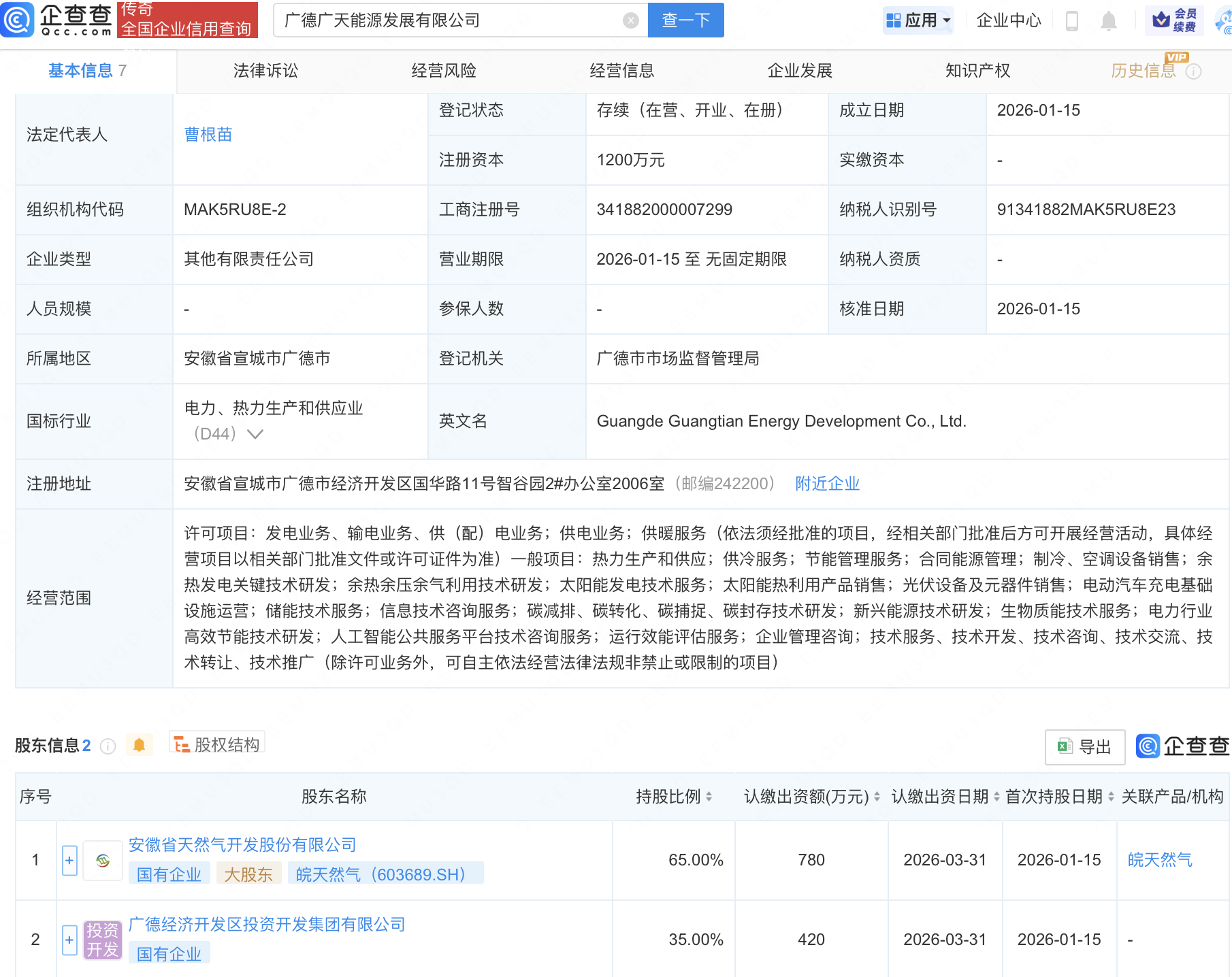 企查查APP显示,近日,广德广天能源发展有限公司成立,注册资本1200万元,经营范围包含:电动汽车充电基础设施运营;储能技术服务;电力行业高效节能技术研发;人工智能公共服务平台技术咨询服务等。企查查股权穿透显示,该公司由皖天然气(603689)等共同持股。