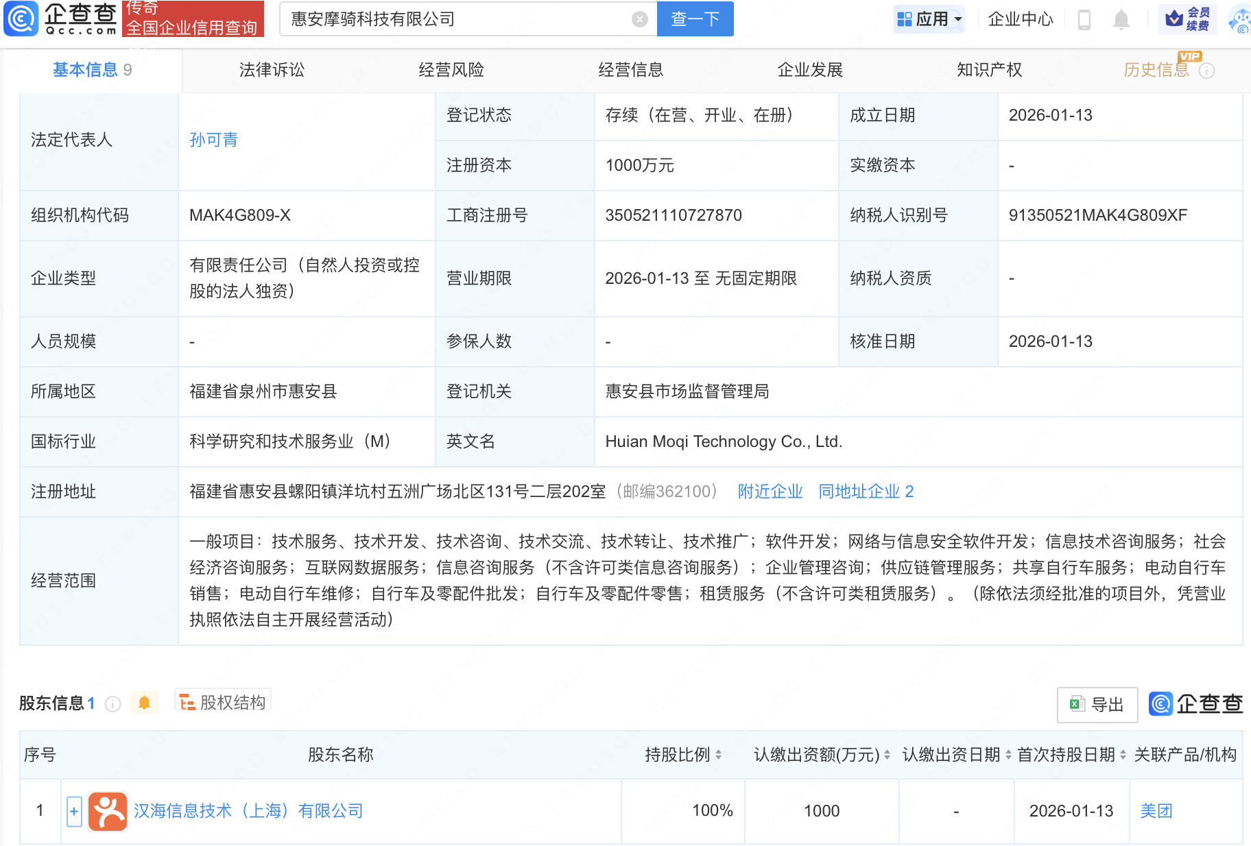 企查查APP显示,近日,惠安摩骑科技有限公司成立,经营范围包含:网络与信息安全软件开发;信息技术咨询服务;社会经济咨询服务;互联网数据服务等。企查查股权穿透显示,该公司由美团关联公司汉海信息技术(上海)有限公司全资持股。