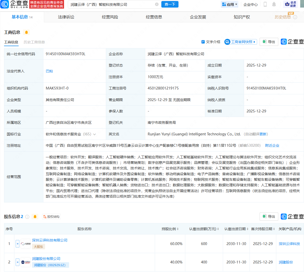 企查查APP显示,近日,润建云译(广西)智能科技有限公司成立,法定代表人为巴灿,注册资本为1000万元,经营范围包含:人工智能硬件销售;人工智能应用软件开发;人工智能基础软件开发;智能车载设备制造等。企查查股权穿透显示,该公司由深圳云译科技有限公司、润建股份(002929)共同持股。