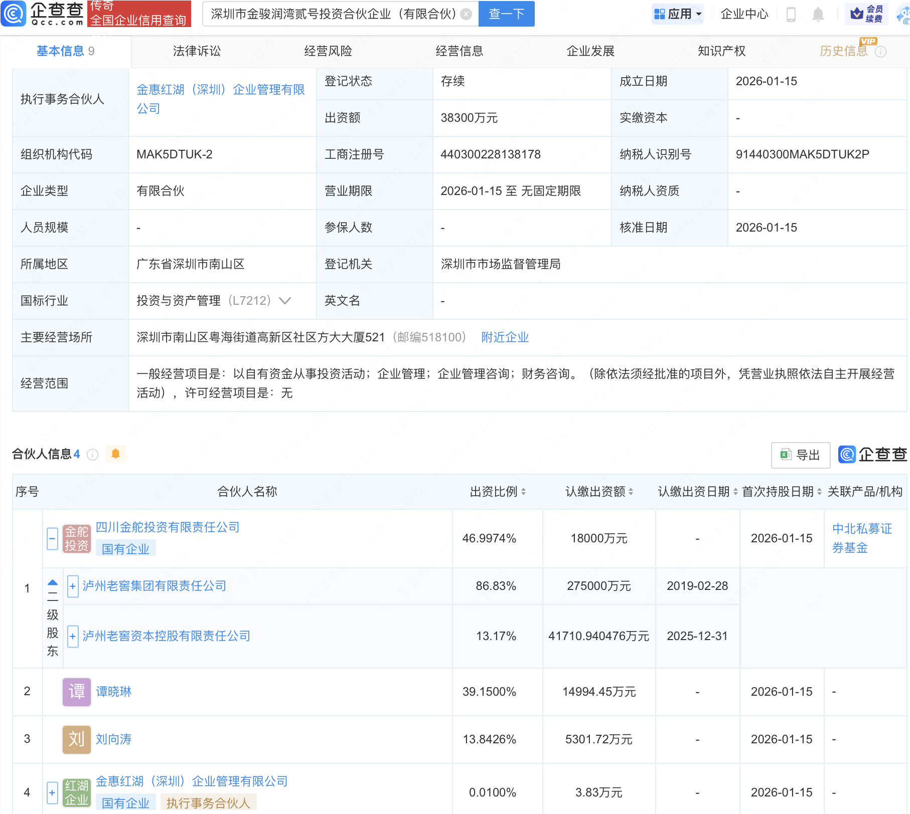 企查查APP显示,近日,深圳市金骏润湾贰号投资合伙企业(有限合伙)成立,出资额3.83亿元,经营范围包含:以自有资金从事投资活动;企业管理;企业管理咨询;财务咨询。企查查股权穿透显示,该企业由泸州老窖集团有限责任公司旗下四川金舵投资有限责任公司等共同出资。