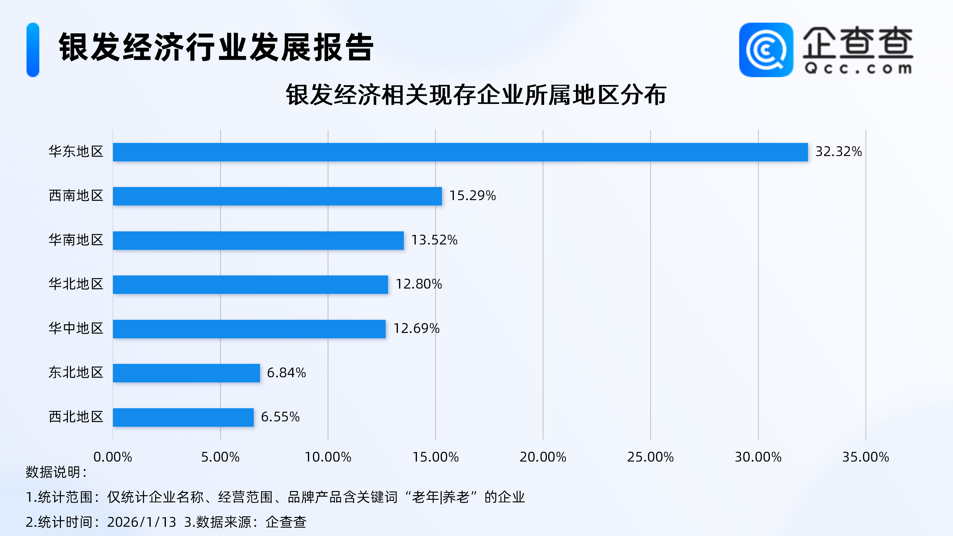 企查查数据显示,截至1月13日,国内银发经济相关现存企业达55.25万家,超3成相关企业分布在华东地区,占比达32.32%,其次为西南地区,占比达15.29%。分布在东北、西北地区的相关企业占比均不足10%。