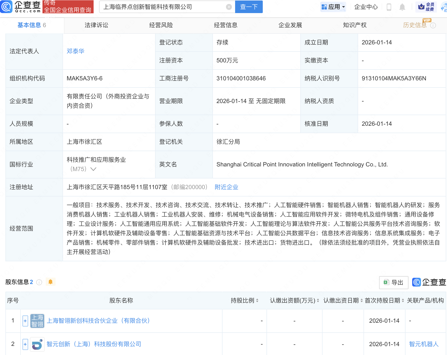 企查查APP显示,近日,上海临界点创新智能科技有限公司成立,经营范围包含:人工智能基础软件开发;人工智能理论与算法软件开发;人工智能公共服务平台技术咨询服务等。企查查股权穿透显示,该公司由智元机器人关联公司智元创新(上海)科技股份有限公司等共同持股。