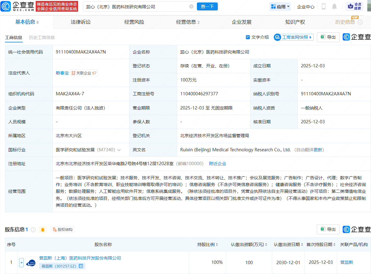 企查查APP显示,近日,蕊心(北京)医药科技研究有限公司成立,法定代表人为赖春宝,经营范围包含:医学研究和试验发展;健康咨询服务(不含诊疗服务);社会经济咨询服务;数据处理服务;人工智能应用软件开发等。企查查股权穿透显示,该公司由普蕊斯(301257)全资持股。