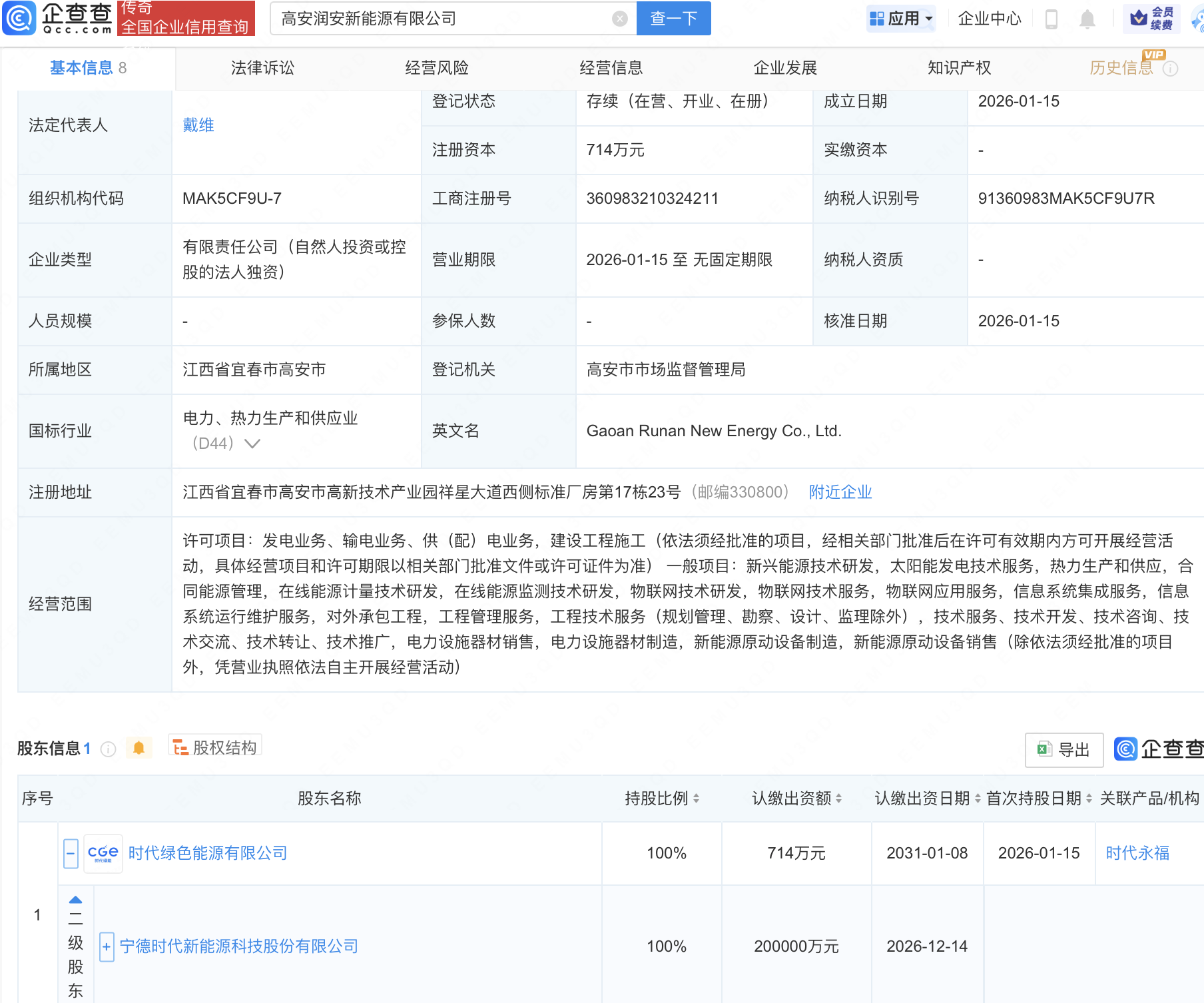 企查查APP显示,近日,高安润安新能源有限公司成立,经营范围包含:在线能源计量技术研发,在线能源监测技术研发,物联网技术研发,物联网技术服务,物联网应用服务等。企查查股权穿透显示,该公司由宁德时代(300750)间接全资持股。