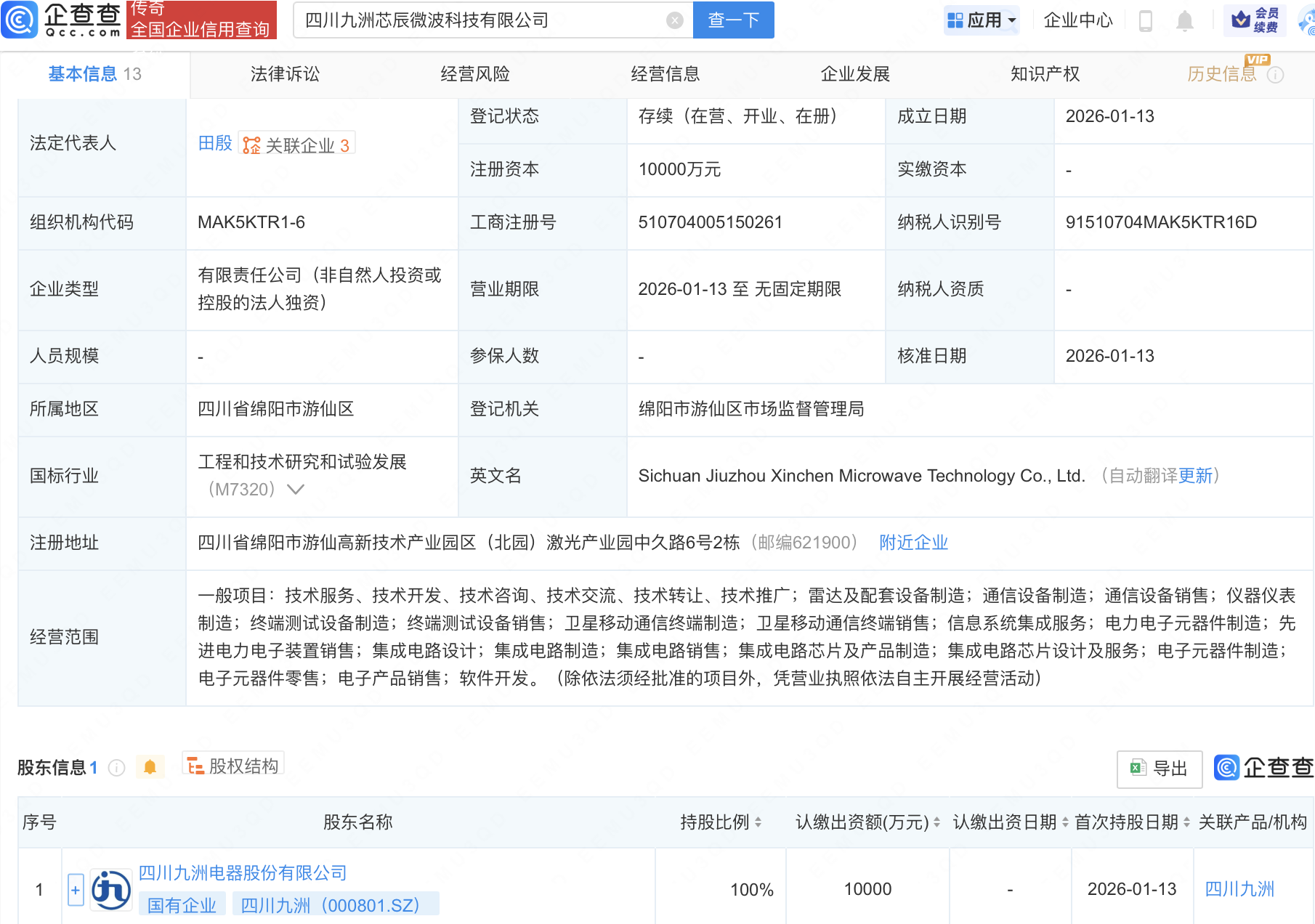 企查查APP显示,近日,四川九洲芯辰微波科技有限公司成立,注册资本1亿元,经营范围包含:卫星移动通信终端制造;卫星移动通信终端销售;集成电路芯片及产品制造;集成电路芯片设计及服务等。企查查股权穿透显示,该公司由四川九洲(000801)全资持股。