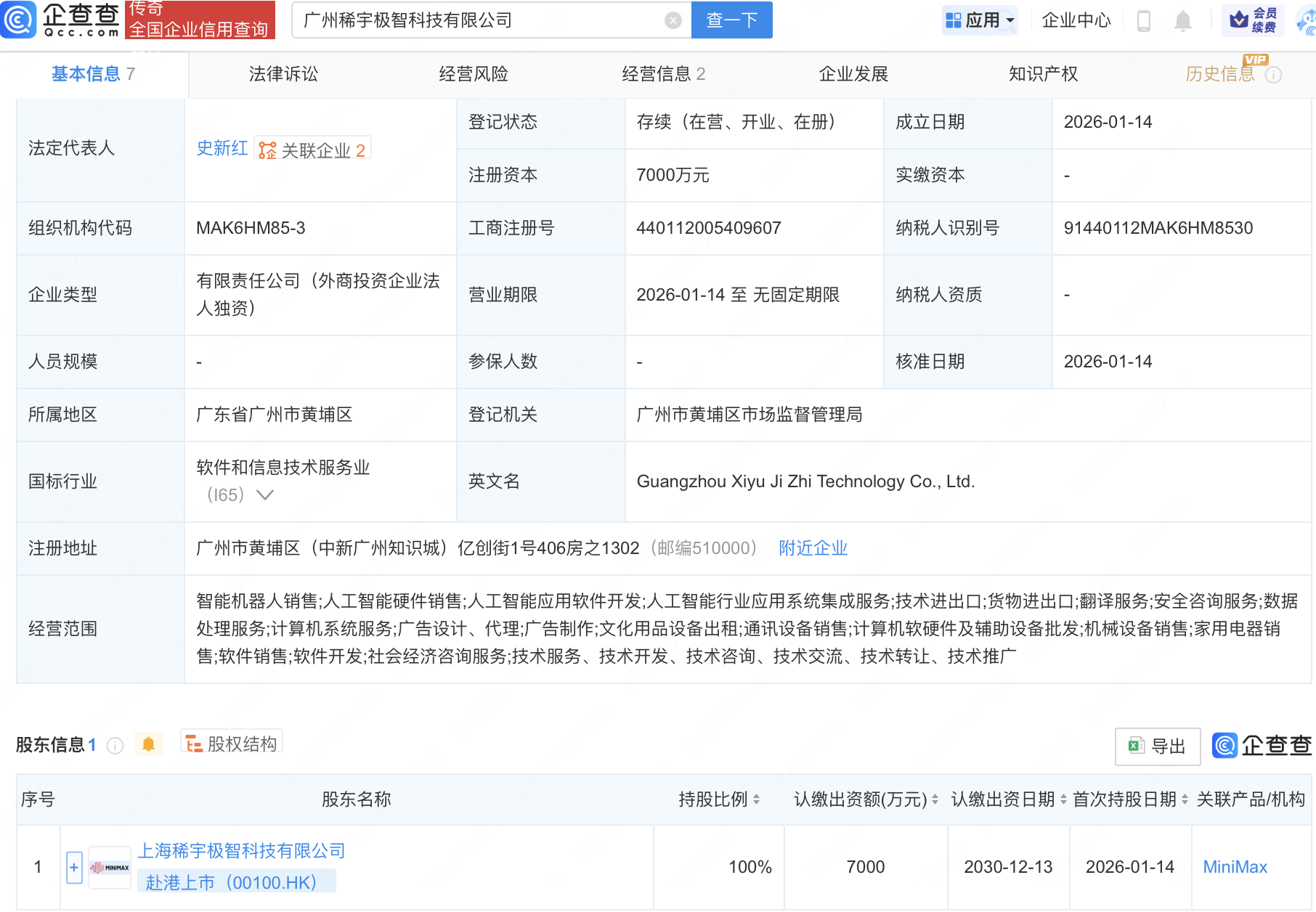 企查查APP显示,近日,广州稀宇极智科技有限公司成立,注册资本7000万元,经营范围包含:智能机器人销售;人工智能硬件销售;人工智能应用软件开发;人工智能行业应用系统集成服务等。企查查股权穿透显示,该公司由MiniMax关联公司上海稀宇极智科技有限公司全资持股。