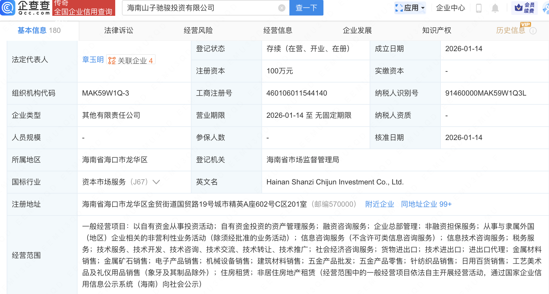 企查查APP显示,近日,海南山子驰骏投资有限公司成立,经营范围包含:金属材料销售;金属矿石销售;电子产品销售;机械设备销售;建筑材料销售等。企查查股权穿透显示,该公司由山子高科(000981)间接全资持股。