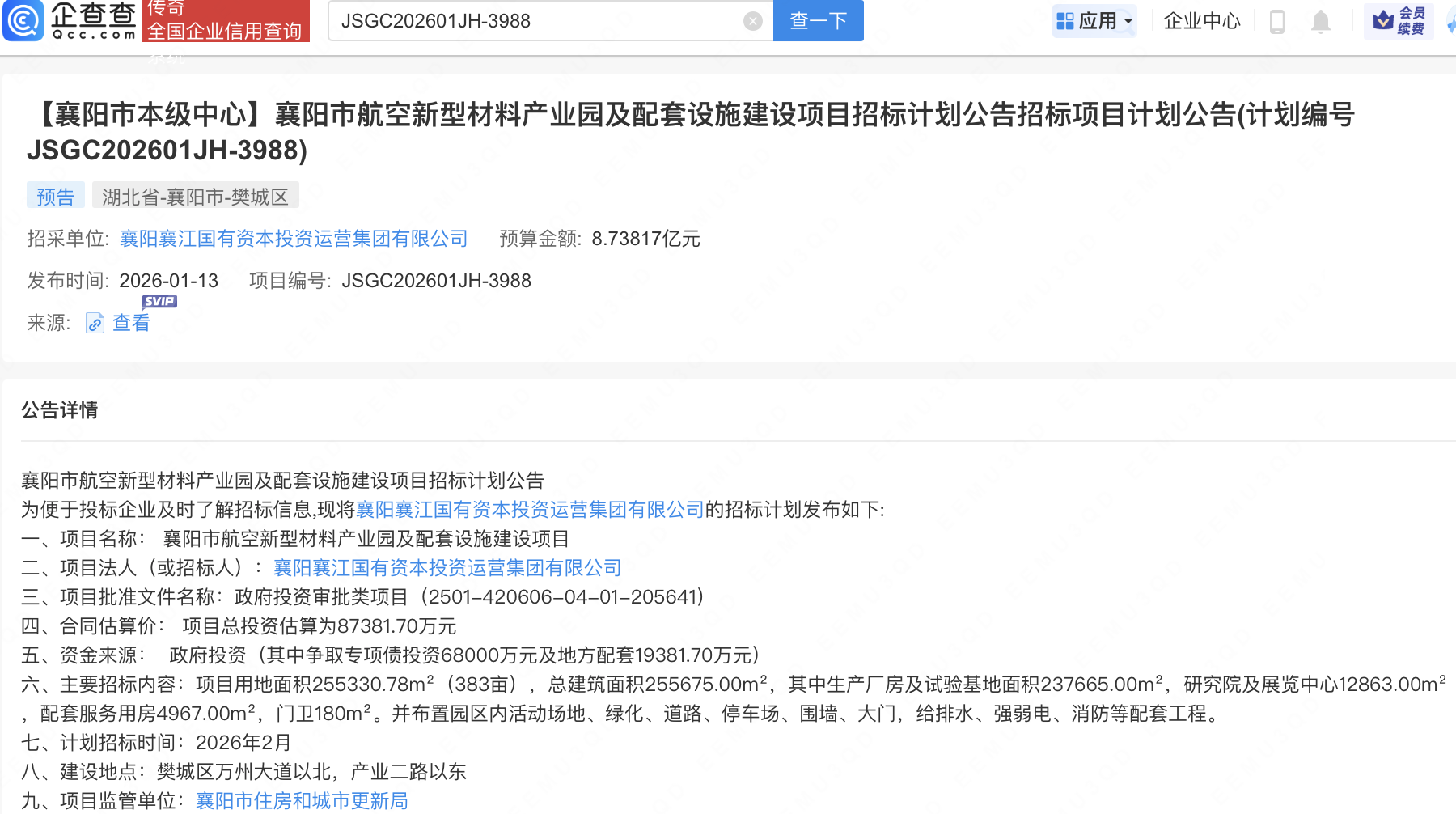企查查APP显示,近日,襄阳市航空新型材料产业园及配套设施建设项目招标计划公告发布,招采单位为襄阳襄江国有资本投资运营集团有限公司,预算金额8.7亿元,计划招标时间为2026年2月。
