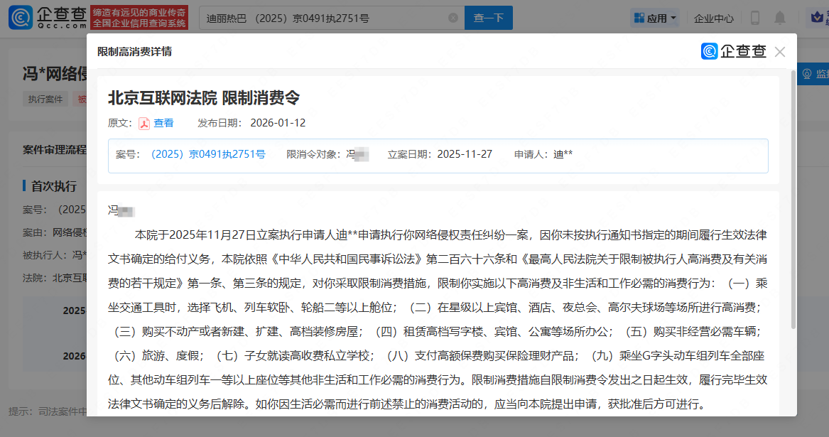 企查查APP显示,近日,在迪丽热巴申请执行冯某网络侵权责任纠纷一案中,因冯某未按期履行给付义务,法院对其采取限制高消费措施。案件流程显示,在该案中冯某曾被法院执行10000元。
