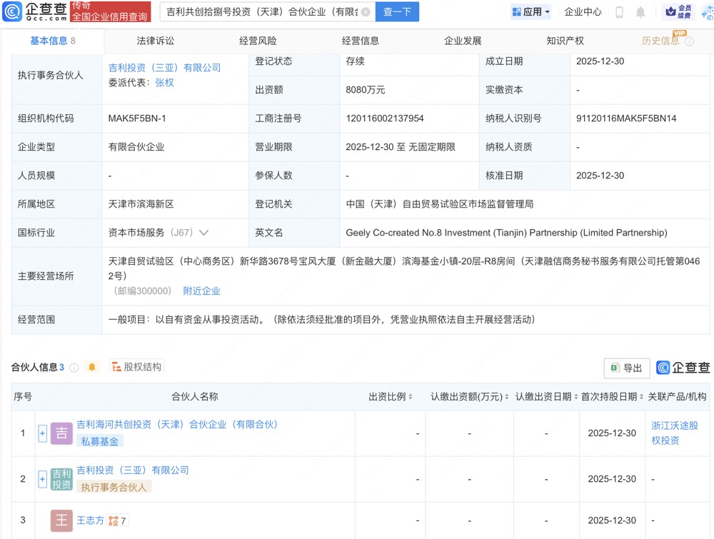 企查查APP显示,近日,吉利共创拾捌号投资(天津)合伙企业(有限合伙)成立,经营范围包含:以自有资金从事投资活动。企查查股权穿透显示,该企业由吉利海河共创投资(天津)合伙企业(有限合伙)、吉利投资(三亚)有限公司等共同出资。
