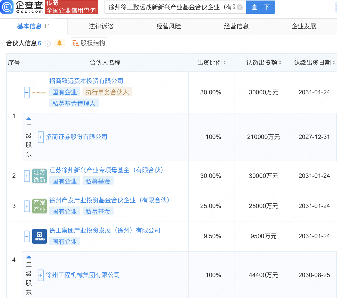 企查查APP显示,近日,徐州徐工致远战新新兴产业基金合伙企业(有限合伙)成立,出资额10亿元,经营范围包含:以私募基金从事股权投资、投资管理、资产管理等活动。企查查股权穿透显示,该企业由招商证券(600999)全资子公司招商致远资本投资有限公司、徐州工程机械集团有限公司全资子公司徐工集团产业投资发展(徐州)有限公司等共同出资。