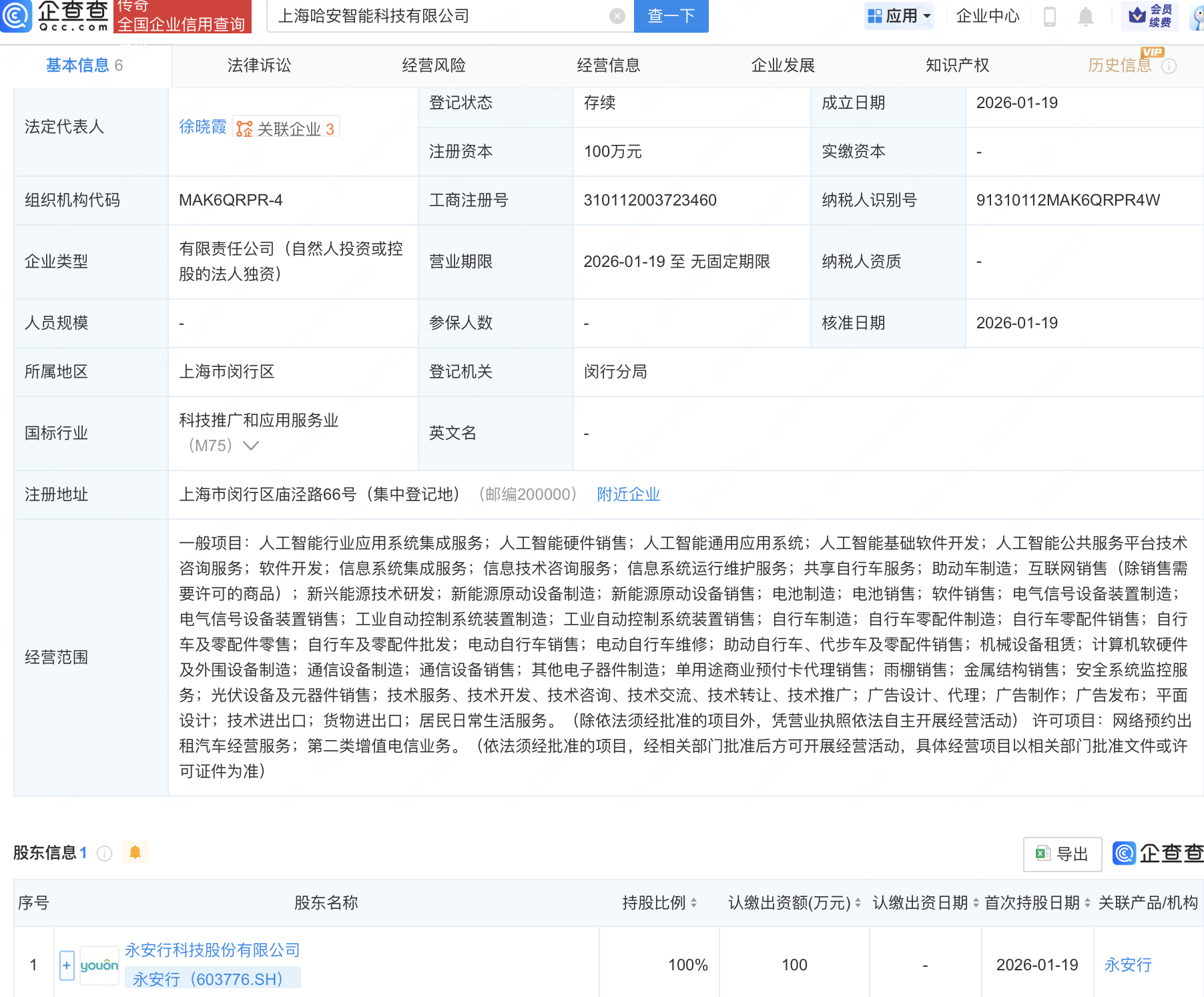 企查查APP显示,近日,上海哈安智能科技有限公司成立,经营范围包含:人工智能行业应用系统集成服务;人工智能硬件销售;人工智能通用应用系统;人工智能基础软件开发;人工智能公共服务平台技术咨询服务等。企查查股权穿透显示,该公司由永安行(603776)全资持股。