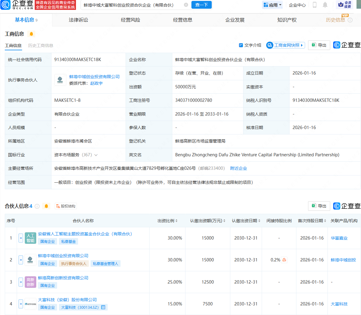企查查APP显示,近日,蚌埠中城大富智科创业投资合伙企业(有限合伙)成立,出资额5亿元,经营范围包含:创业投资(限投资未上市企业)。企查查股权穿透显示,该合伙企业由安徽省人工智能主题投资基金合伙企业(有限合伙)、蚌埠中城创业投资有限公司、大富科技(300134)等共同持股。