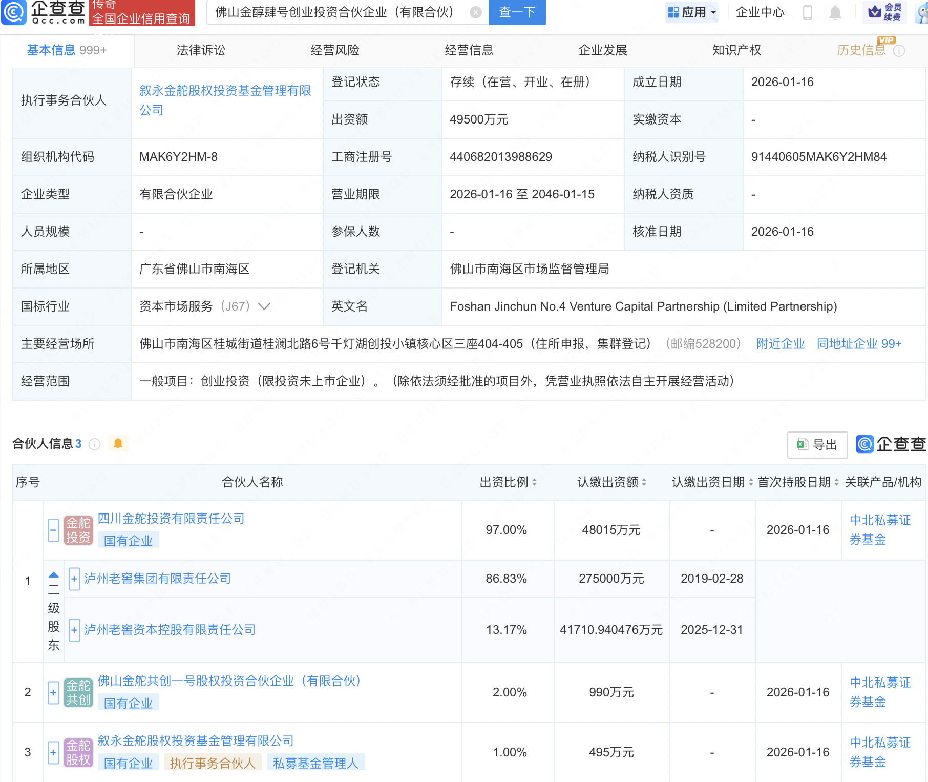 企查查APP显示,近日,佛山金醇肆号创业投资合伙企业(有限合伙)成立,出资额4.95亿元,经营范围包含:创业投资(限投资未上市企业)。企查查股权穿透显示,该企业由泸州老窖集团有限责任公司旗下四川金舵投资有限责任公司等共同出资。