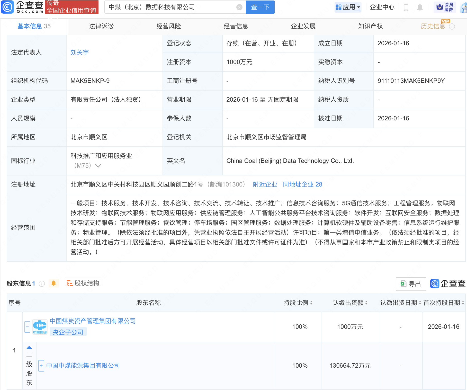 企查查APP显示,近日,中煤(北京)数据科技有限公司成立,注册资本1000万元,经营范围包含:物联网应用服务;供应链管理服务;人工智能公共服务平台技术咨询服务;软件开发等。企查查股权穿透显示,该公司由中国中煤能源集团有限公司间接全资持股。
