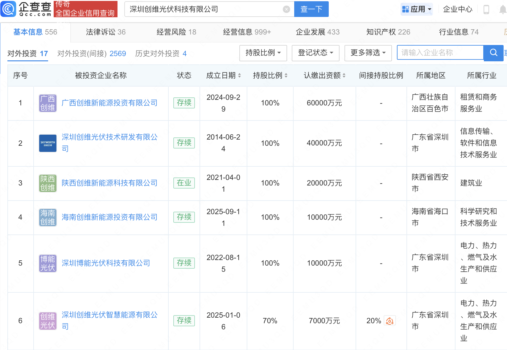 企查查APP显示,近日,深圳创维光伏科技有限公司间接投资多家新能源公司,包括百色启源科技有限公司、河北维储新能源科技有限公司、银川新创源科新能源科技有限公司等。