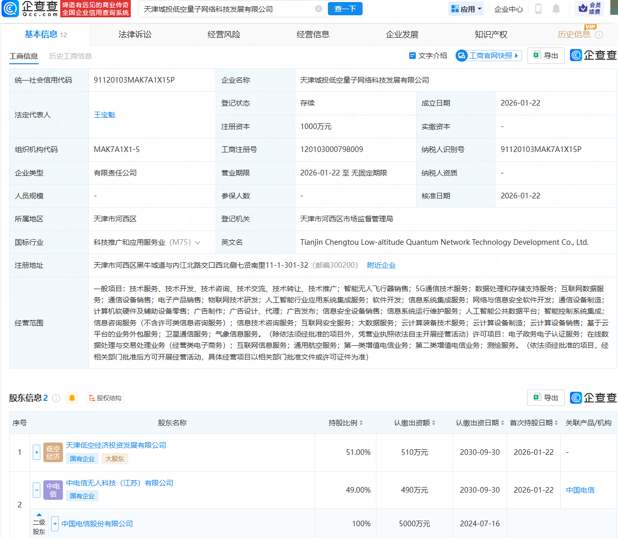 企查查APP显示,近日,天津城投低空量子网络科技发展有限公司成立,法定代表人为王宝魁,注册资本为1000万元,经营范围包含:智能无人飞行器销售;5G通信技术服务;数据处理和存储支持服务;互联网数据服务等。企查查股权穿透显示,该公司由天津低空经济投资发展有限公司、中国电信(601728)全资子公司中电信无人科技(江苏)有限公司共同持股。