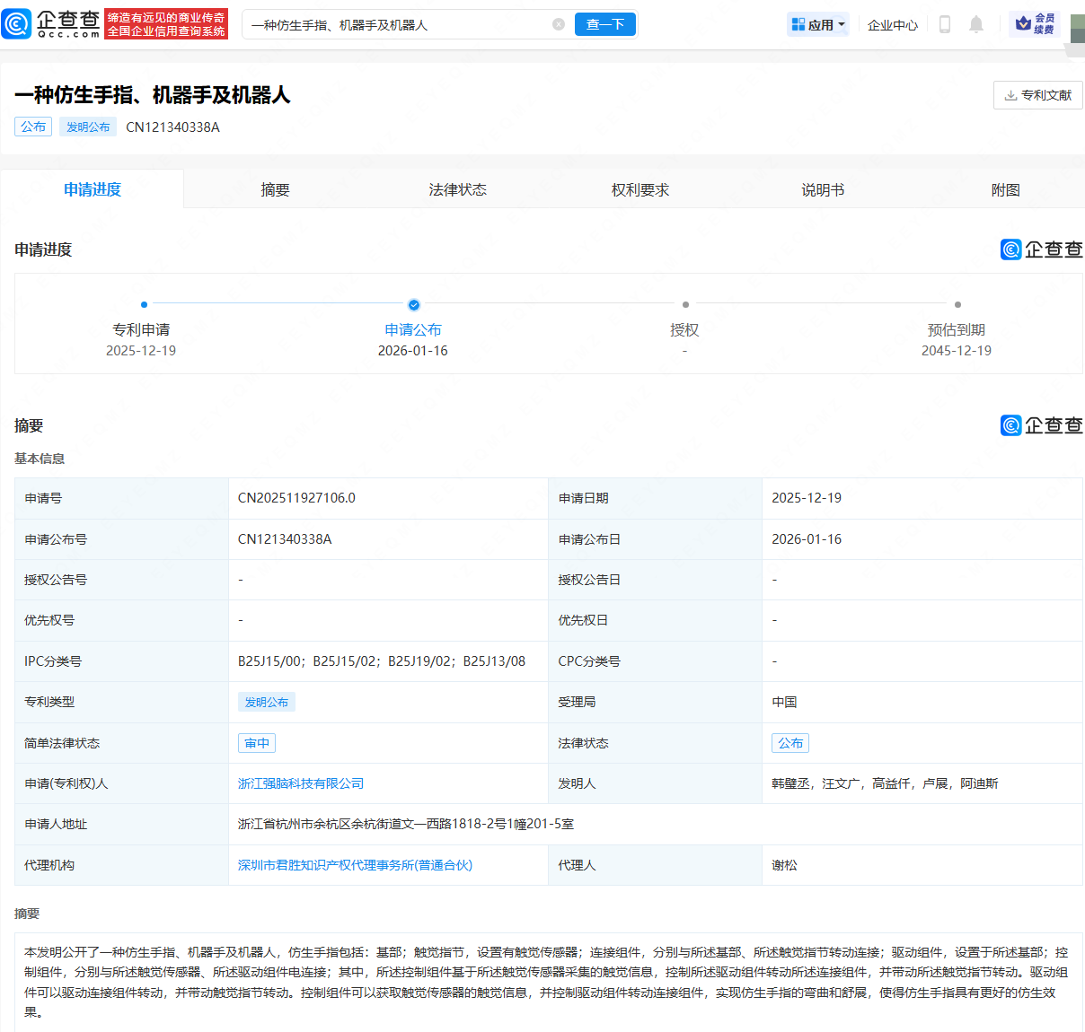 企查查APP显示,近日,浙江强脑科技有限公司申请公布“一种仿生手指、机器手及机器人”专利。