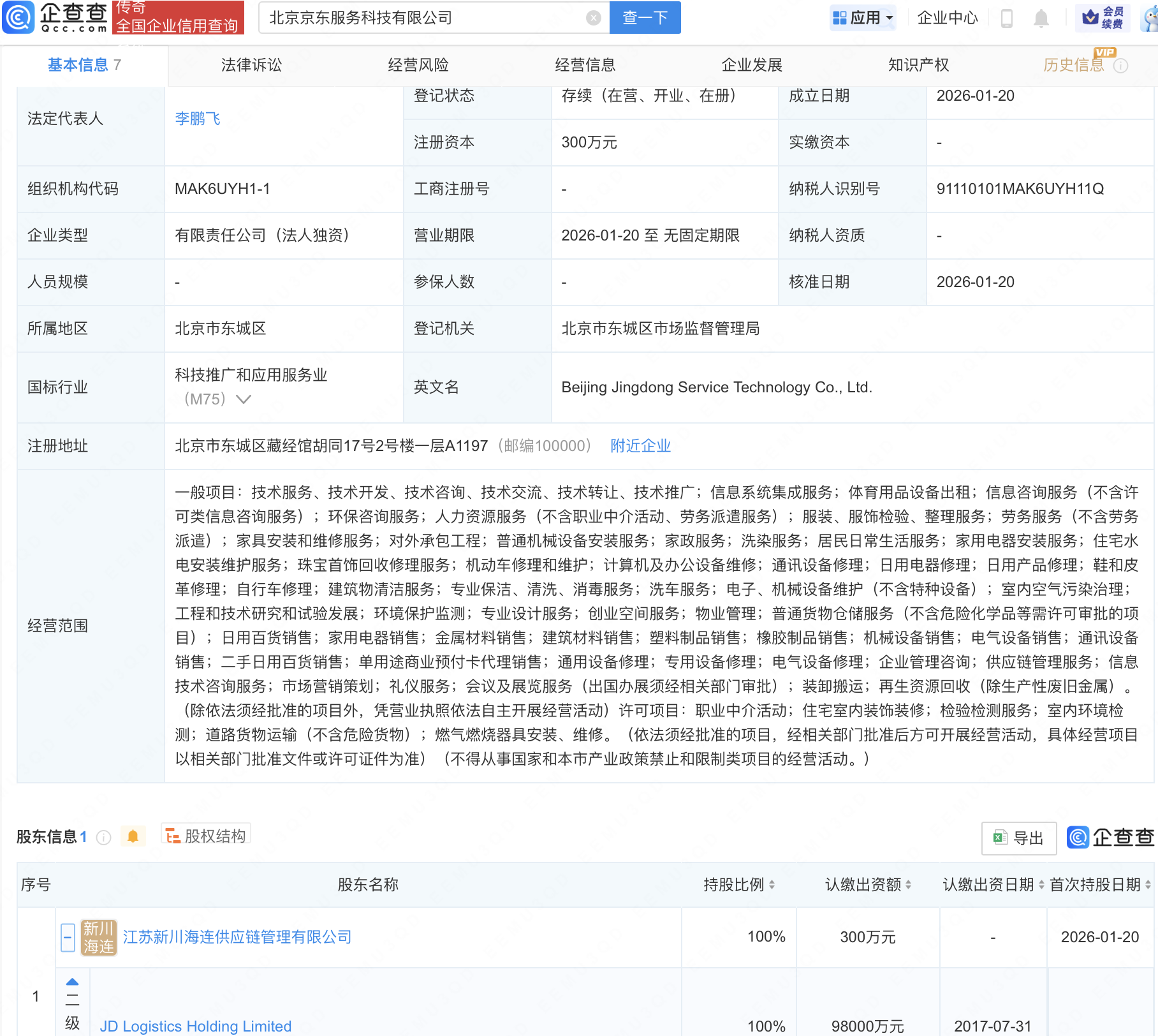 企查查APP显示,近日,北京京东服务科技有限公司成立,经营范围包含:工程和技术研究和试验发展;环境保护监测;专业设计服务;创业空间服务等。企查查股权穿透显示,该公司由JD Logistics Holding Limited间接全资持股。
