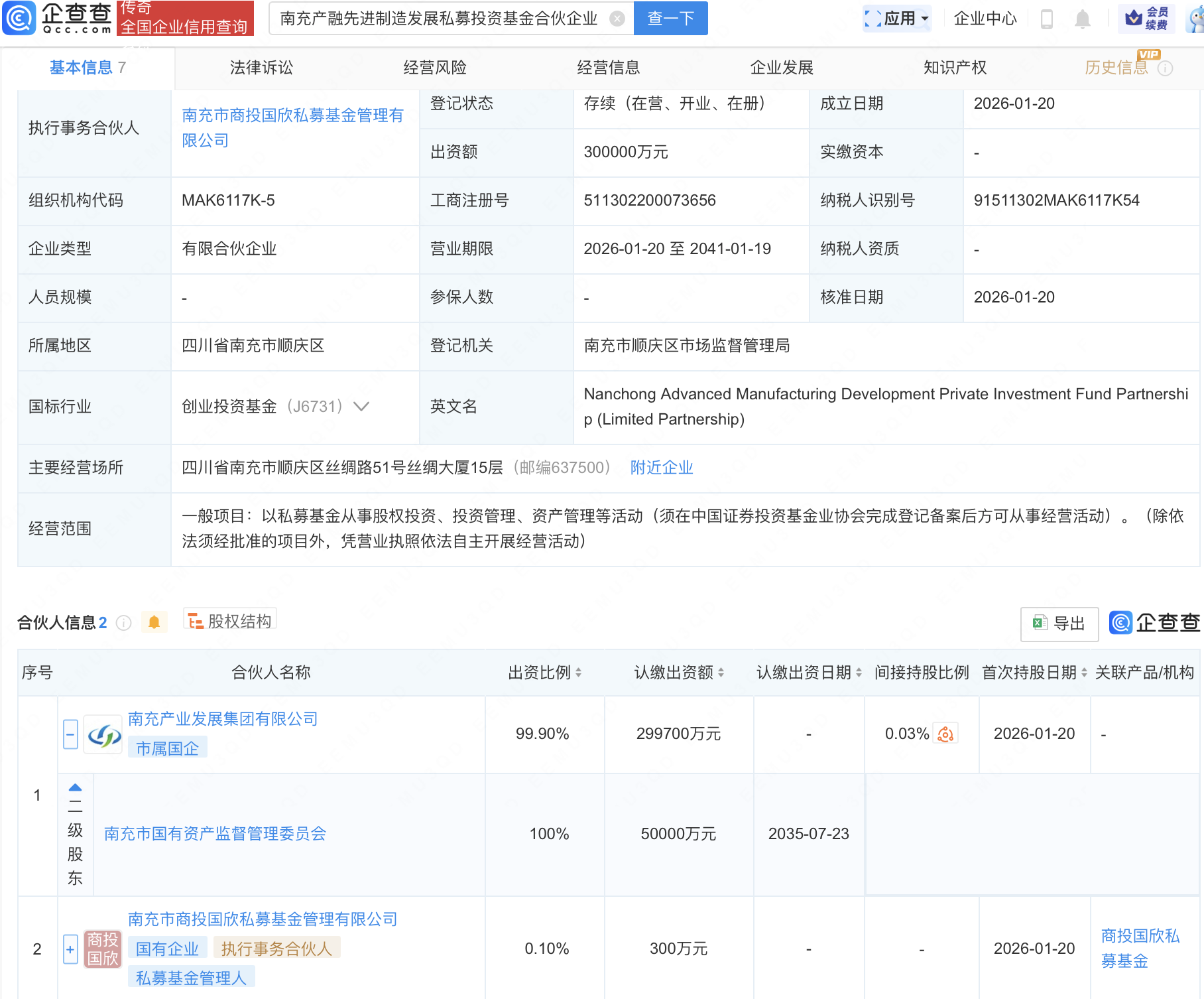 企查查APP显示,近日,南充产融先进制造发展私募投资基金合伙企业(有限合伙)成立,出资额30亿元,经营范围包含:以私募基金从事股权投资、投资管理、资产管理等活动。企查查股权穿透显示,该企业由南充产业发展集团有限公司等共同出资。