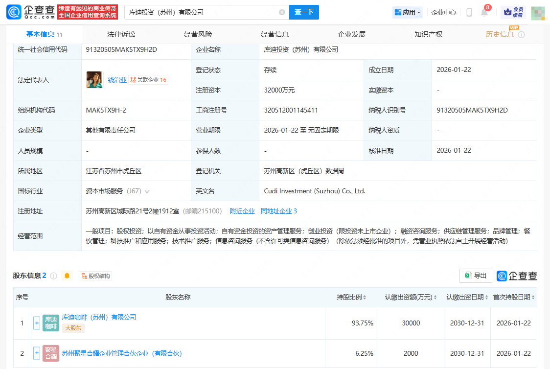 库迪咖啡等3.2亿元在苏州成立投资公司