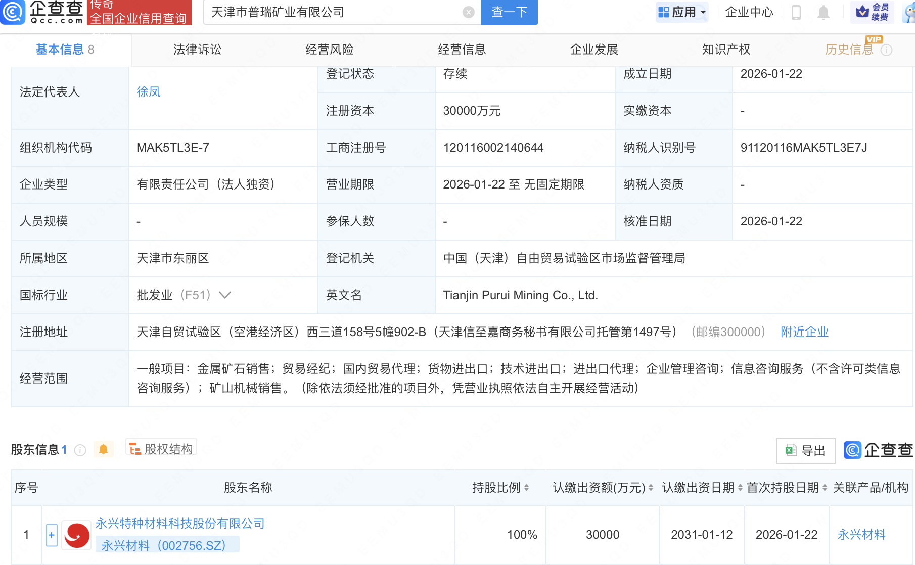 企查查APP显示,近日,天津市普瑞矿业有限公司成立,注册资本3亿元,经营范围包含:金属矿石销售;贸易经纪;国内贸易代理;货物进出口等。企查查股权穿透显示,该公司由永兴材料(002756)全资持股。