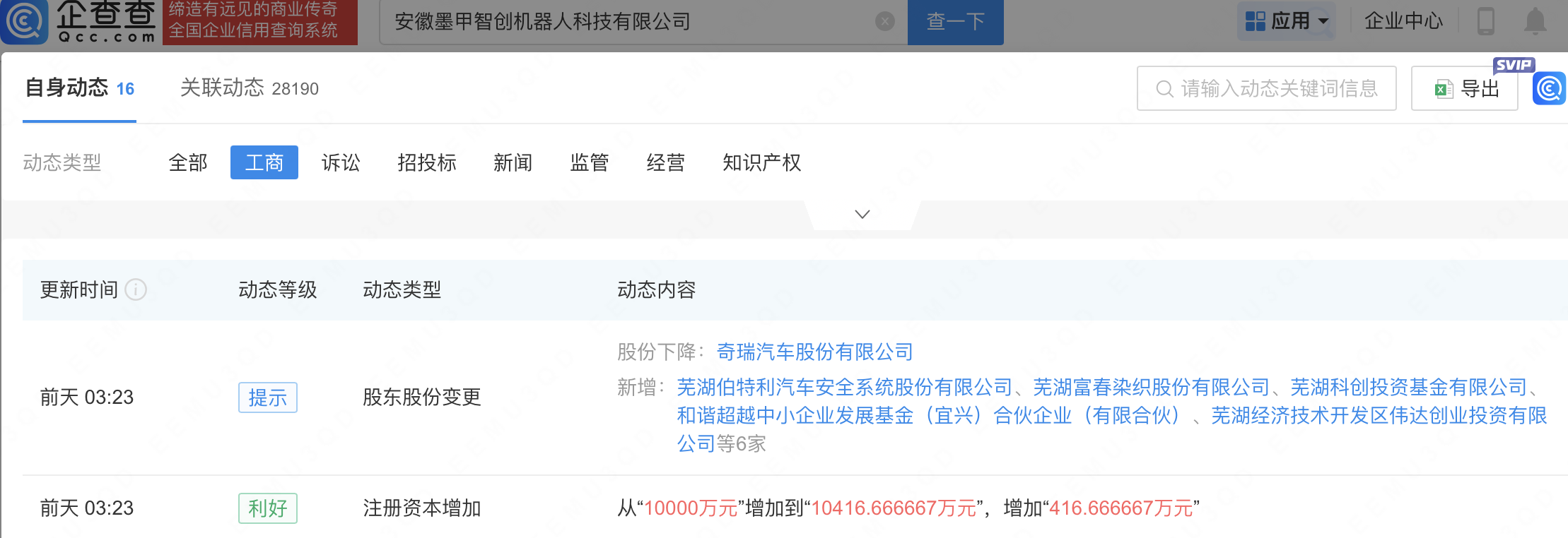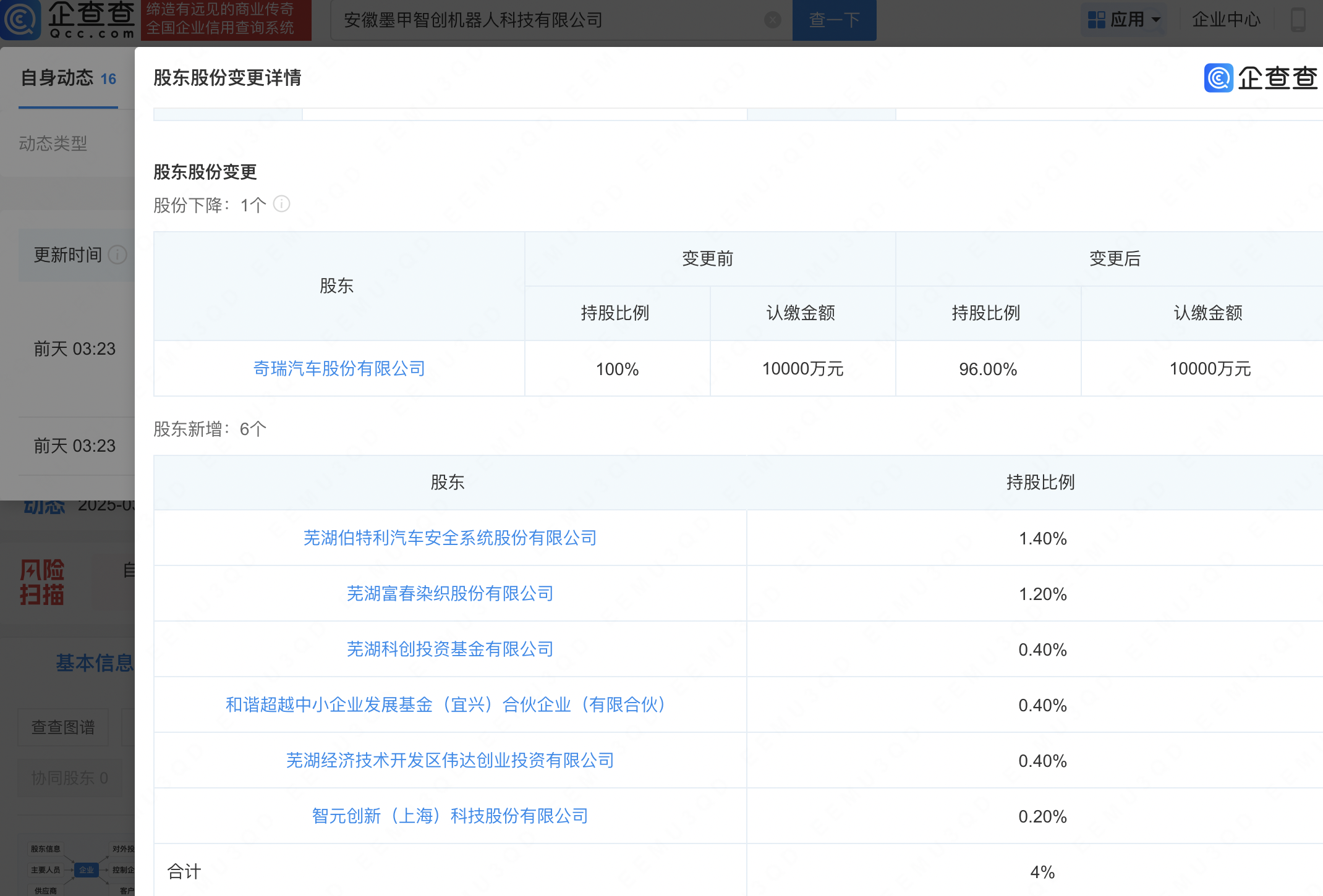 企查查APP显示,近日,安徽墨甲智创机器人科技有限公司发生工商变更,新增智元机器人关联公司智元创新(上海)科技股份有限公司、伯特利(603596)、富春染织(605189)等为股东,同时注册资本增至1.04亿元。企查查信息显示,该公司成立于2025年1月,经营范围包含:智能机器人销售;智能机器人的研发;人工智能应用软件开发;人工智能基础软件开发等,奇瑞汽车(09973.HK)对其持股96%。据其官网,墨甲机器人是奇瑞集团旗下机器人品牌,专注于具身智能的研发与应用。