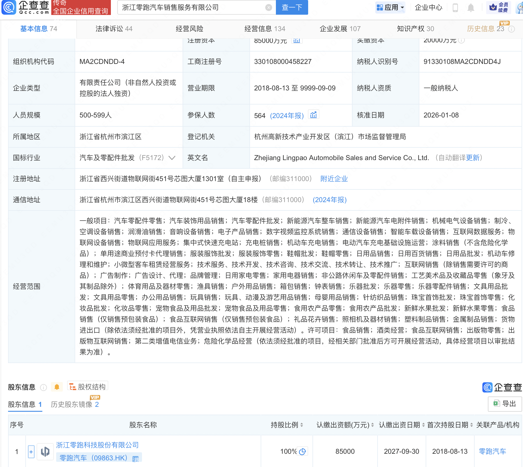 企查查APP显示,近日,浙江零跑汽车销售服务有限公司发生工商变更,注册资本由2亿元增至8.5亿元,增幅325%。企查查信息显示,该公司成立于2018年,由零跑汽车(09863.HK)全资持股。