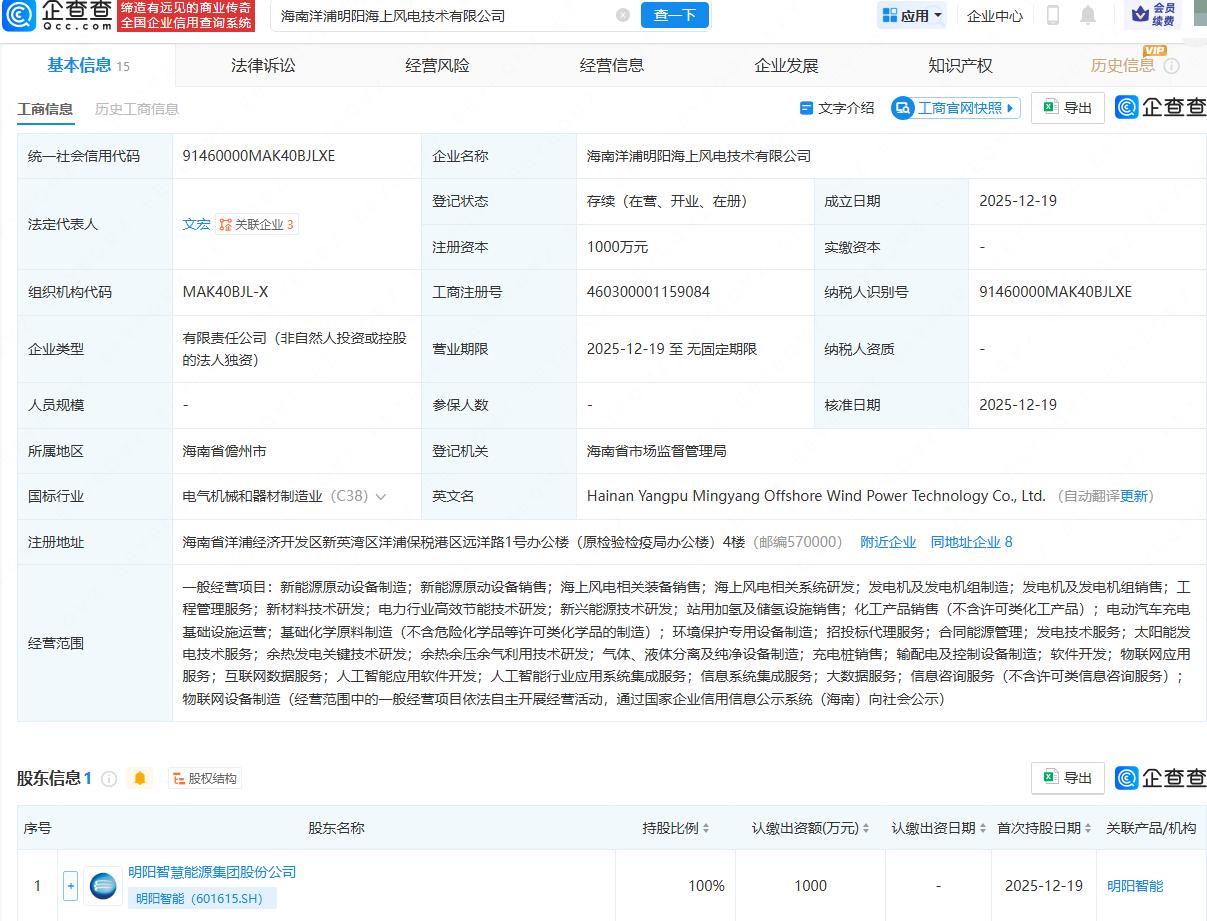 企查查APP显示,近日,海南洋浦明阳海上风电技术有限公司成立,法定代表人为文宏,注册资本为1000万元,经营范围包含:新能源原动设备制造;海上风电相关装备销售;海上风电相关系统研发;发电机及发电机组制造等。企查查股权穿透显示,该公司由明阳智能(601615)全资持股。