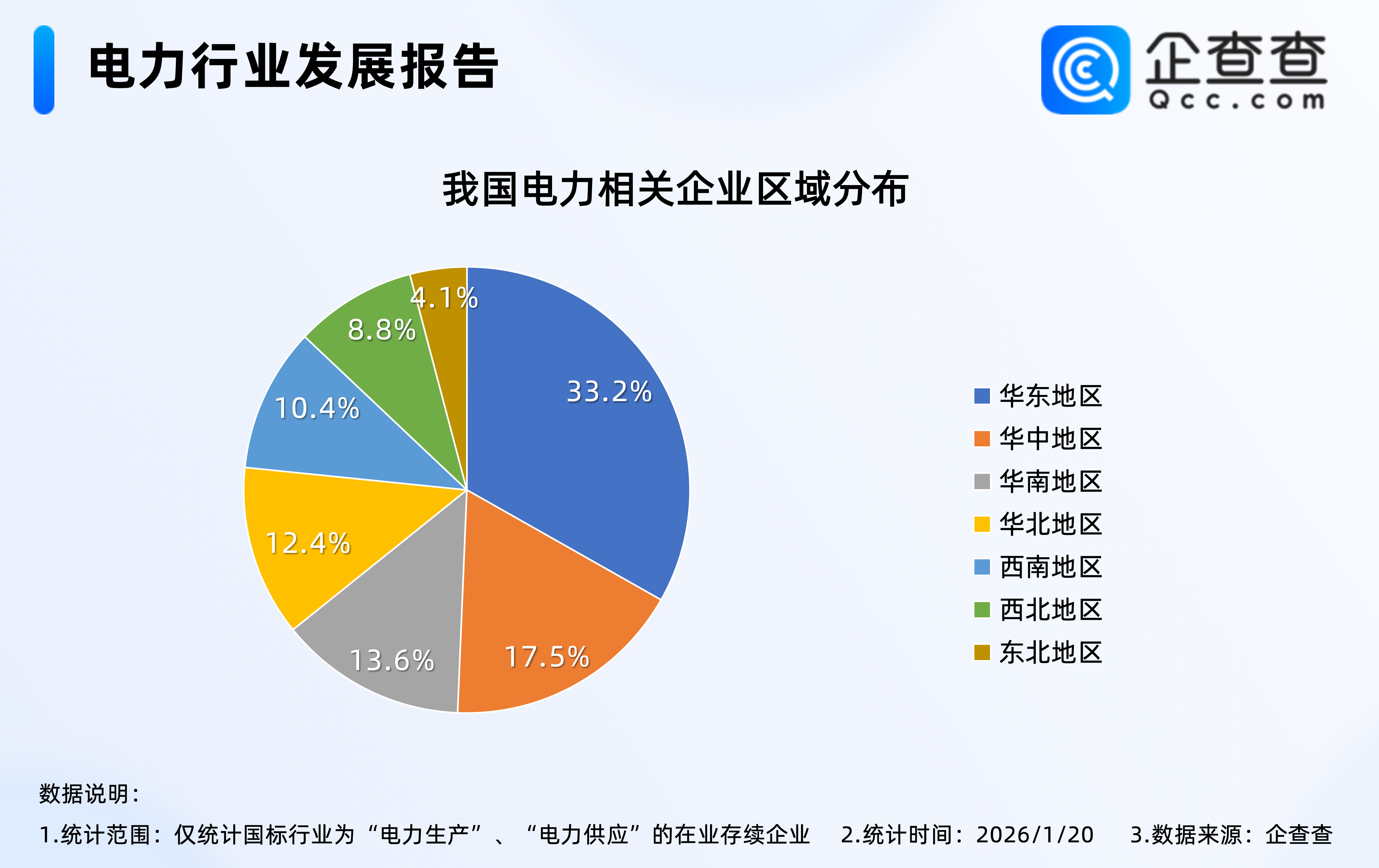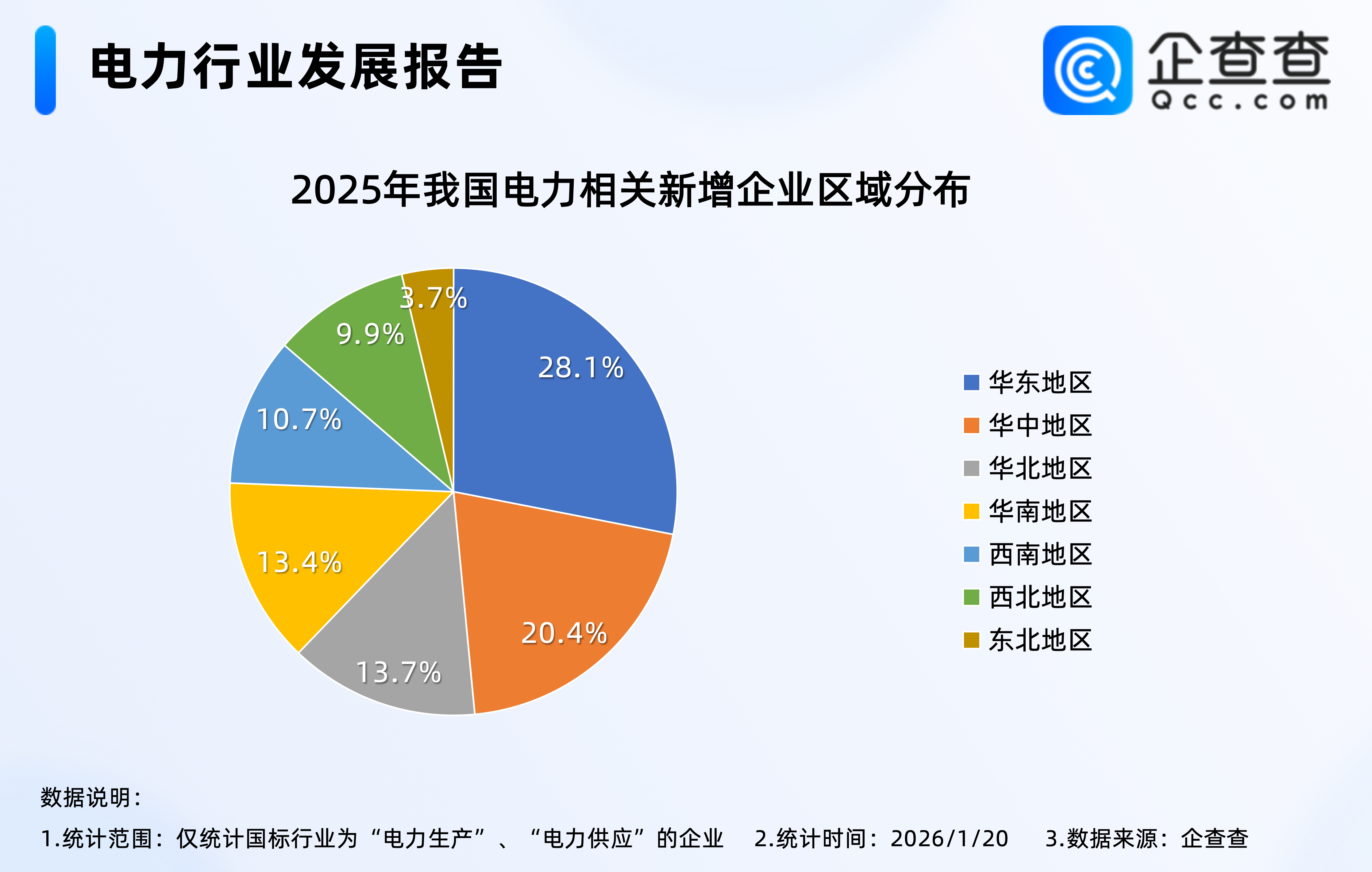 企查查数据显示,截至2026年1月20日,我国现存22.6万家电力相关企业,区域分布上,华东地区最多,占比33.2%,其次是华中、华南地区,分别占比17.5%、13.6%;与全国存量区域分布不同的是,华北地区2025年共注册4154家电力相关企业,占全国当年注册总量的13.7%,超过华南地区,华南地区占比13.4%。