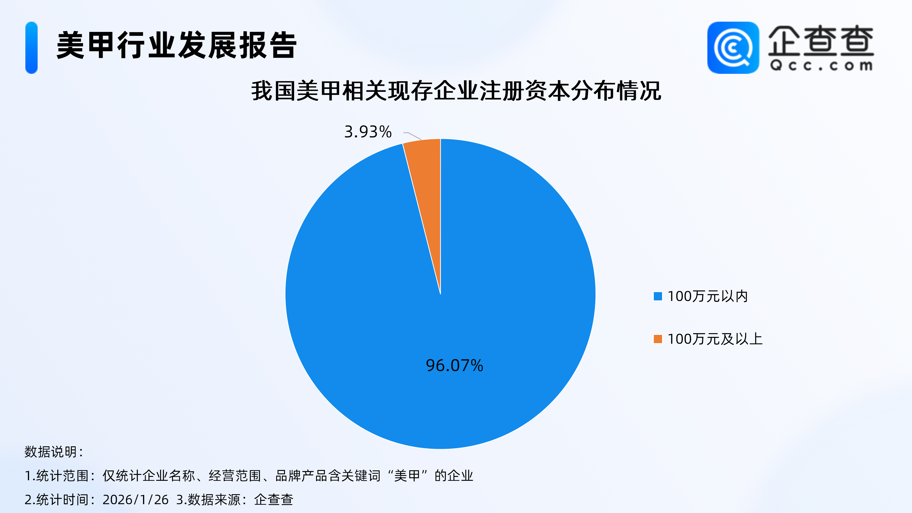 企查查数据显示,注册资本分布方面,截至1月26日,国内现存美甲相关企业达163.55万家,超9成相关企业注册资本在100万元以内,占比达96.07%,注册资本在100万元及以上的相关企业,占比不足4%。