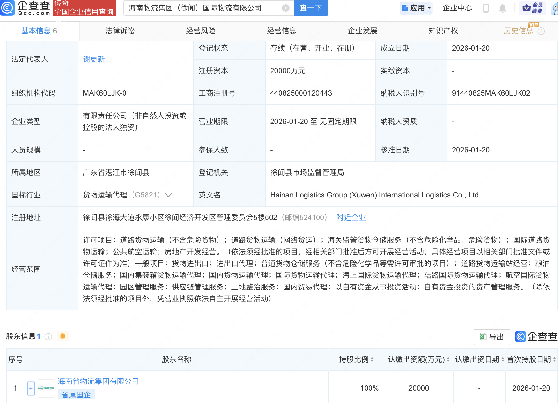 企查查APP显示,近日,海南物流集团(徐闻)国际物流有限公司成立,注册资本2亿元,经营范围包含:陆路国际货物运输代理;航空国际货物运输代理;园区管理服务;供应链管理服务等。企查查股权穿透显示,该公司由海南省物流集团有限公司全资持股。