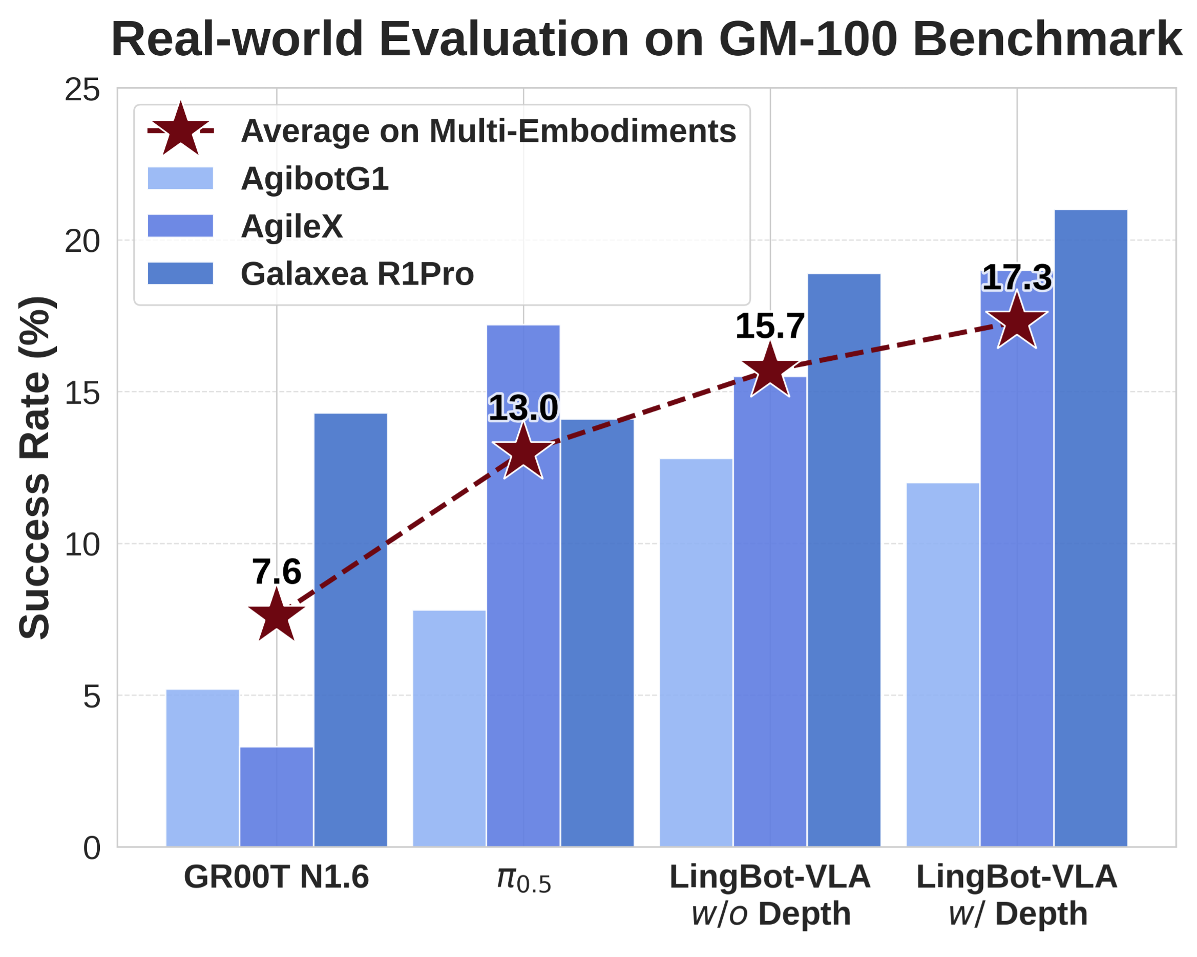 为支撑这一研究,蚂蚁灵波科技构建了覆盖9种主流双臂机器人构型的20000小时真实训练数据集,包括AgileX Cobot Magic、Galaxea R1Pro等机型。在上海交通大学开源的GM-100具身评测基准测试中,LingBot-VLA在3个不同机器人平台上的跨本体泛化平均成功率从13.0%提升至15.7%(无深度信息)。引入深度信息后,其空间感知能力进一步增强,平均成功率攀升至17.3%。