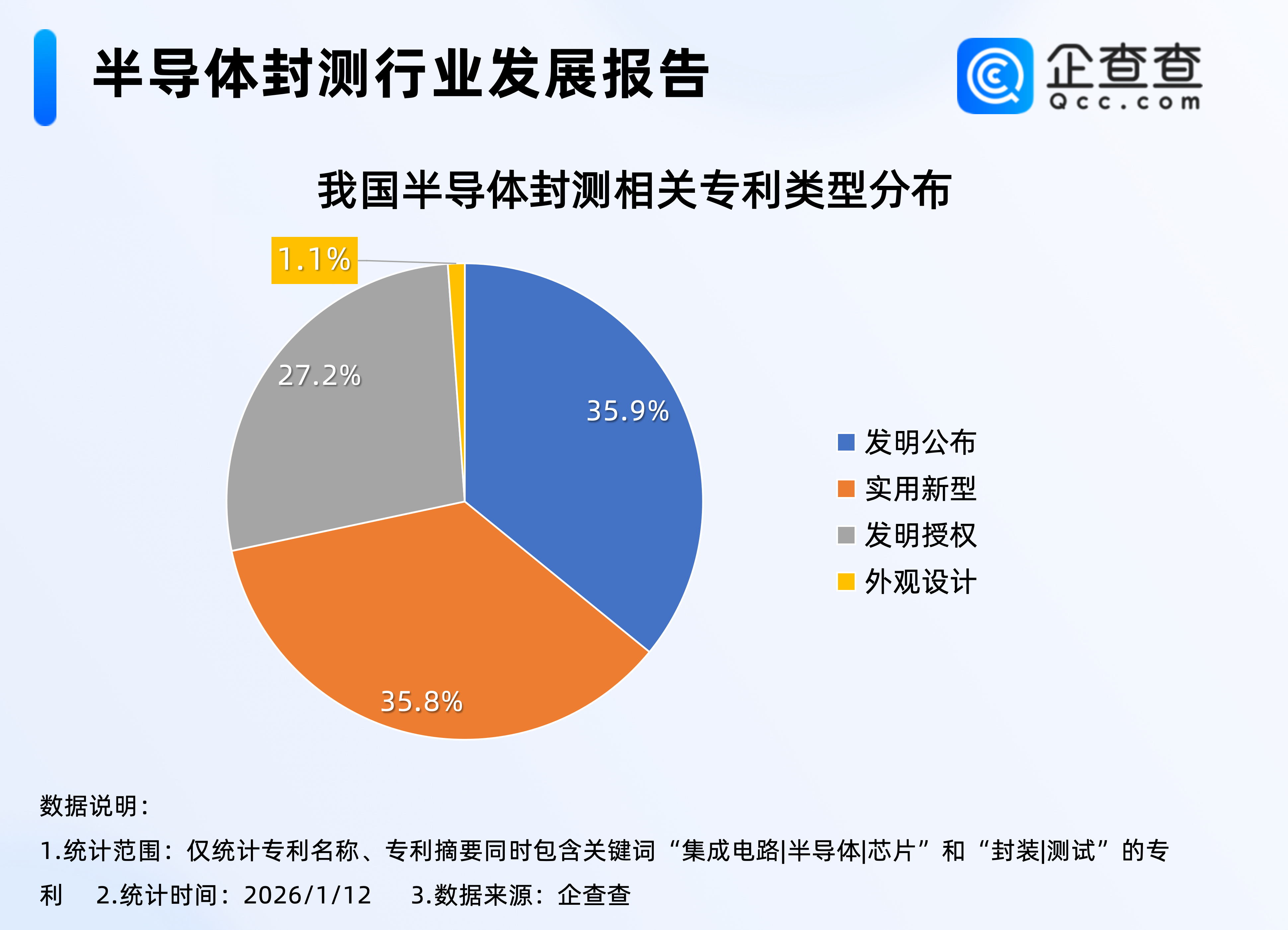 企查查数据显示,我国现有13.9万项半导体封测相关专利,专利类型上,发明专利合计占比63.1%,其中发明公布占比35.9%,发明授权占比27.2%,另有实用新型占比35.8%。