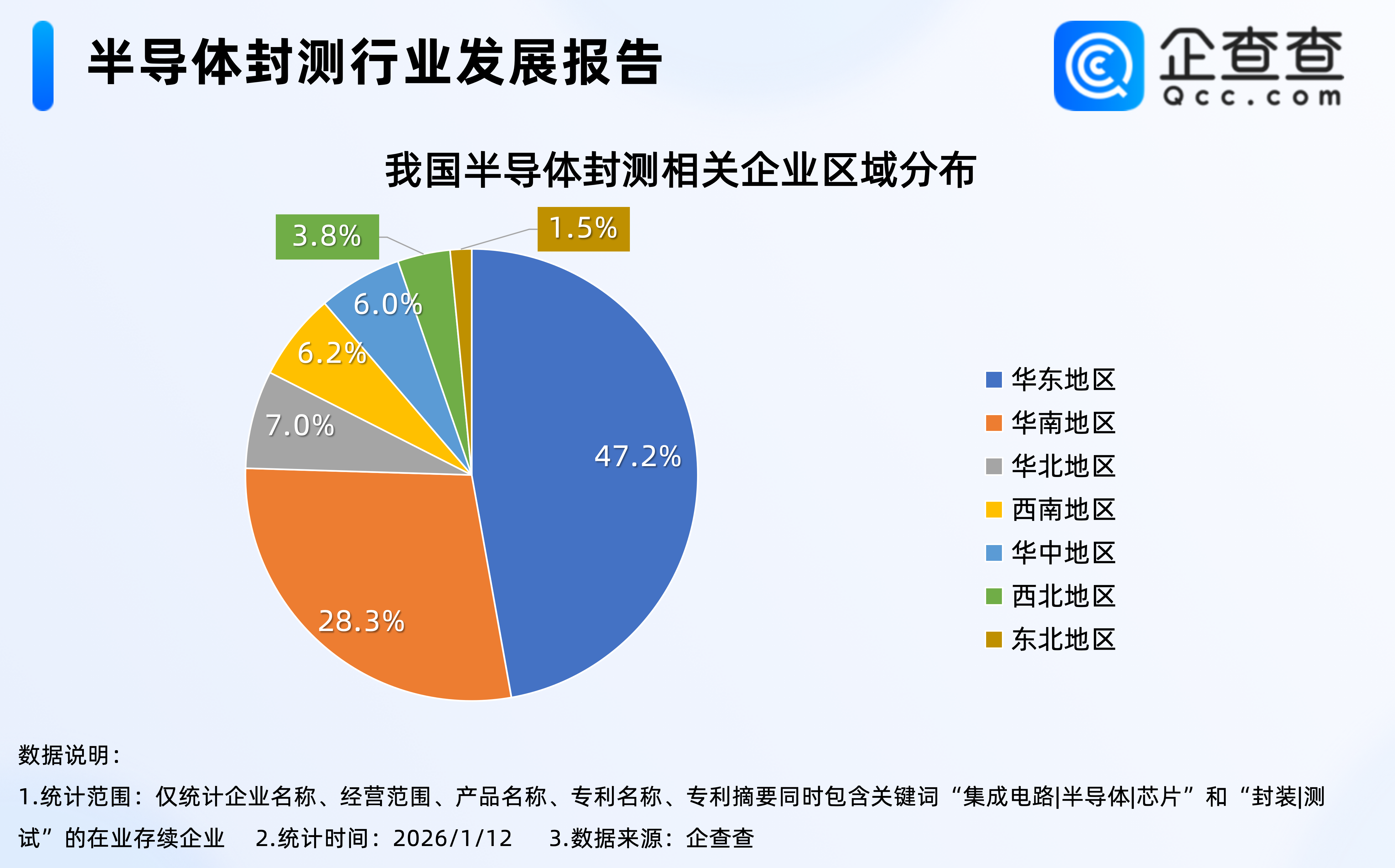 企查查数据显示,截至1月12日,我国现存2.48万家半导体封测相关企业,区域分布上,华东地区最多,占比达47.2%,其次是华南地区,占比28.3%,东北地区相对最少,占比1.5%。