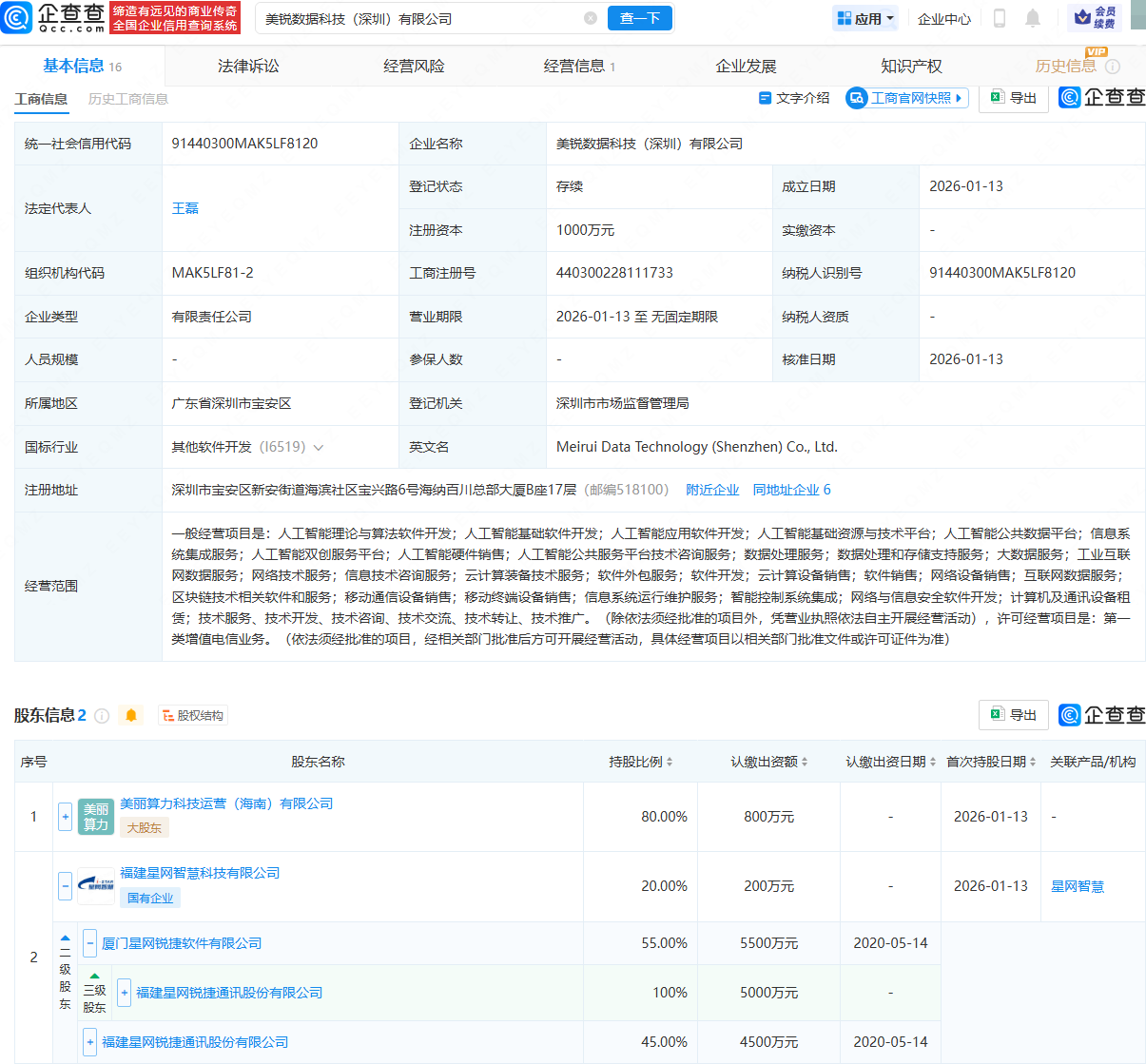企查查APP显示,近日,美锐数据科技(深圳)有限公司成立,法定代表人为王磊,注册资本为1000万元,经营范围包含:人工智能基础软件开发;人工智能应用软件开发;数据处理服务;数据处理和存储支持服务等。企查查股权穿透显示,该公司由美丽算力科技运营(海南)有限公司、星网锐捷(002396)旗下福建星网智慧科技有限公司共同持股。