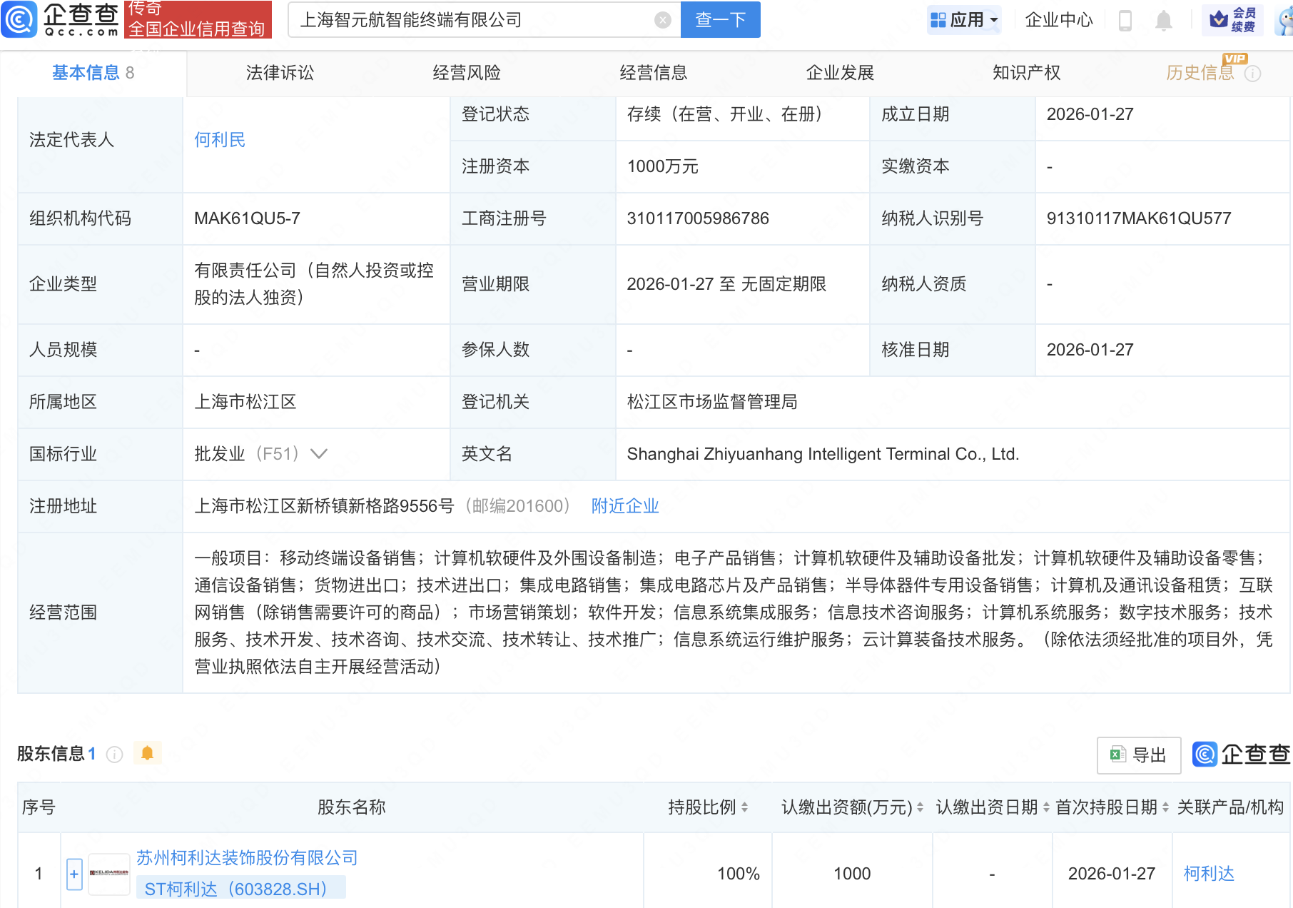 企查查APP显示,近日,上海智元航智能终端有限公司成立,注册资本1000万元,经营范围包含:集成电路销售;集成电路芯片及产品销售;半导体器件专用设备销售;计算机及通讯设备租赁等。企查查股权穿透显示,该公司由ST柯利达(603828)全资持股。