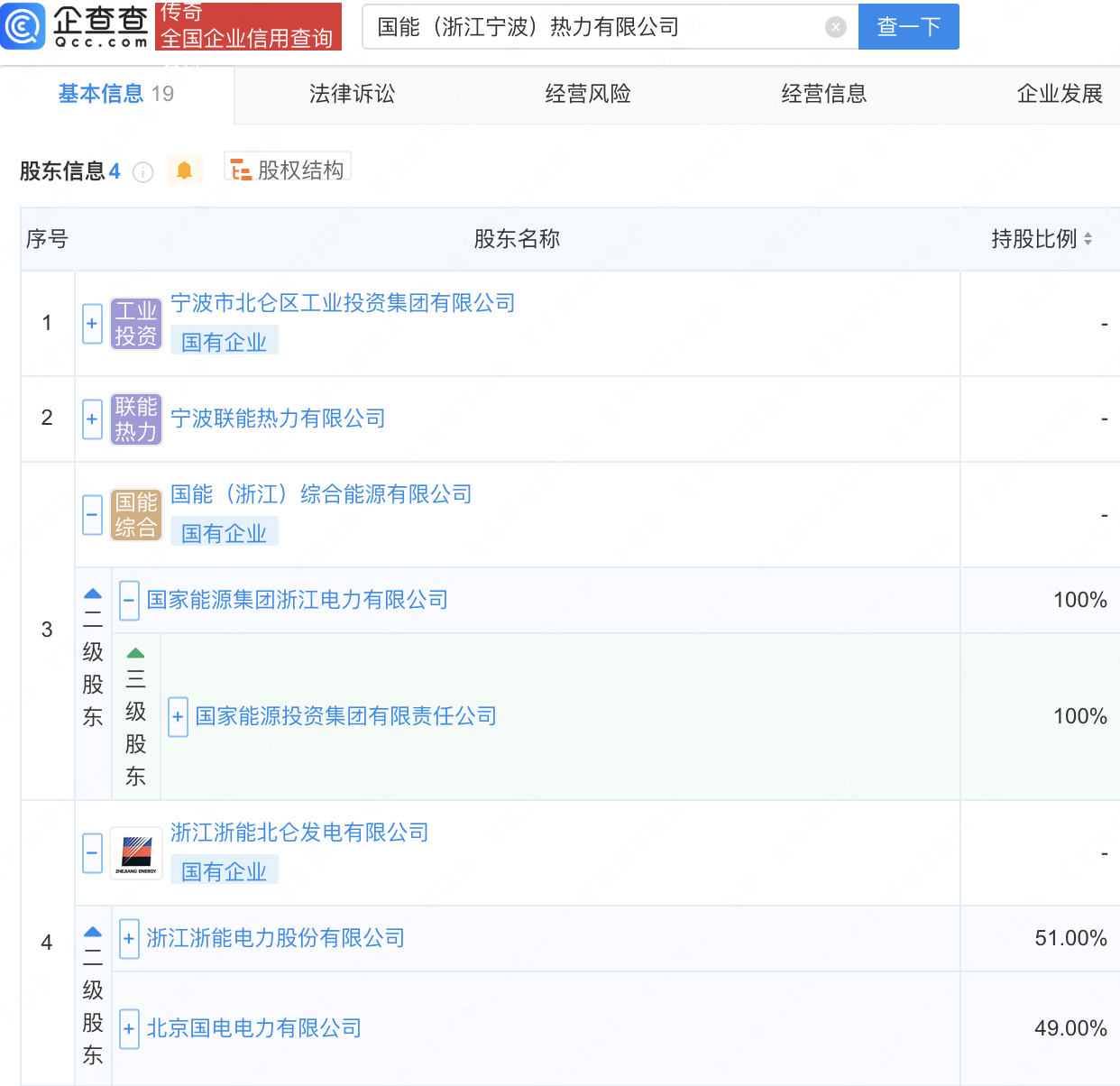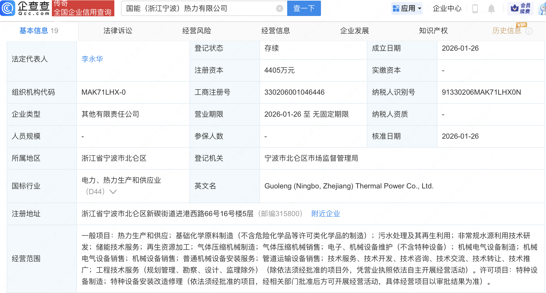 企查查APP显示,近日,国能(浙江宁波)热力有限公司成立,经营范围包含:非常规水源利用技术研发;储能技术服务;再生资源加工;气体压缩机械制造等。企查查股权穿透显示,该公司由国家能源投资集团有限责任公司旗下国能(浙江)综合能源有限公司、浙能电力(600023)旗下浙江浙能北仑发电有限公司等共同持股。