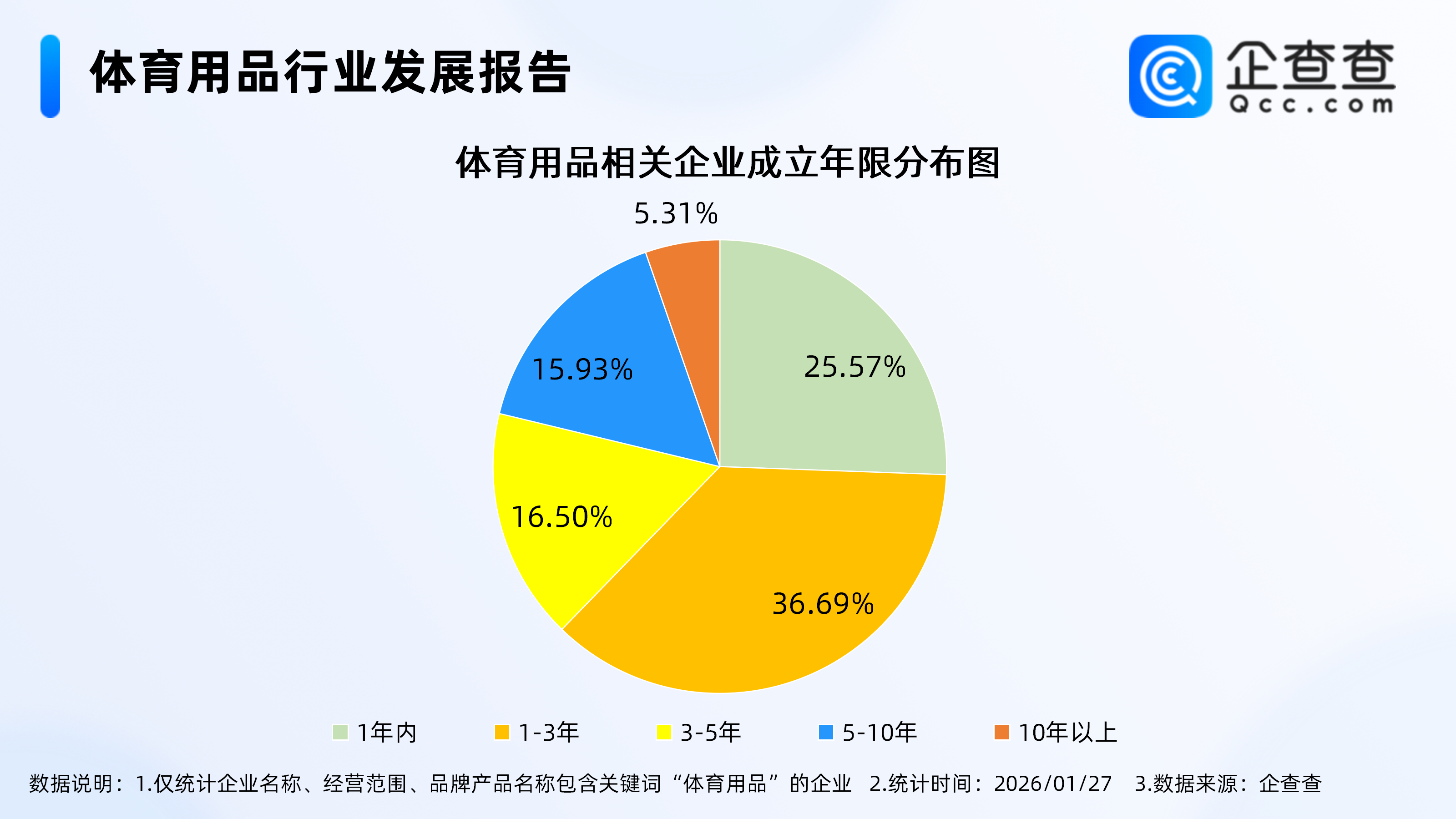 企查查数据显示,从经营时间来看,超六成体育用品相关现存企业成立于近三年,其中成立年限在1-3年的相关企业最多,占比36.69%,成立于1年内的相关企业占比25.57%。