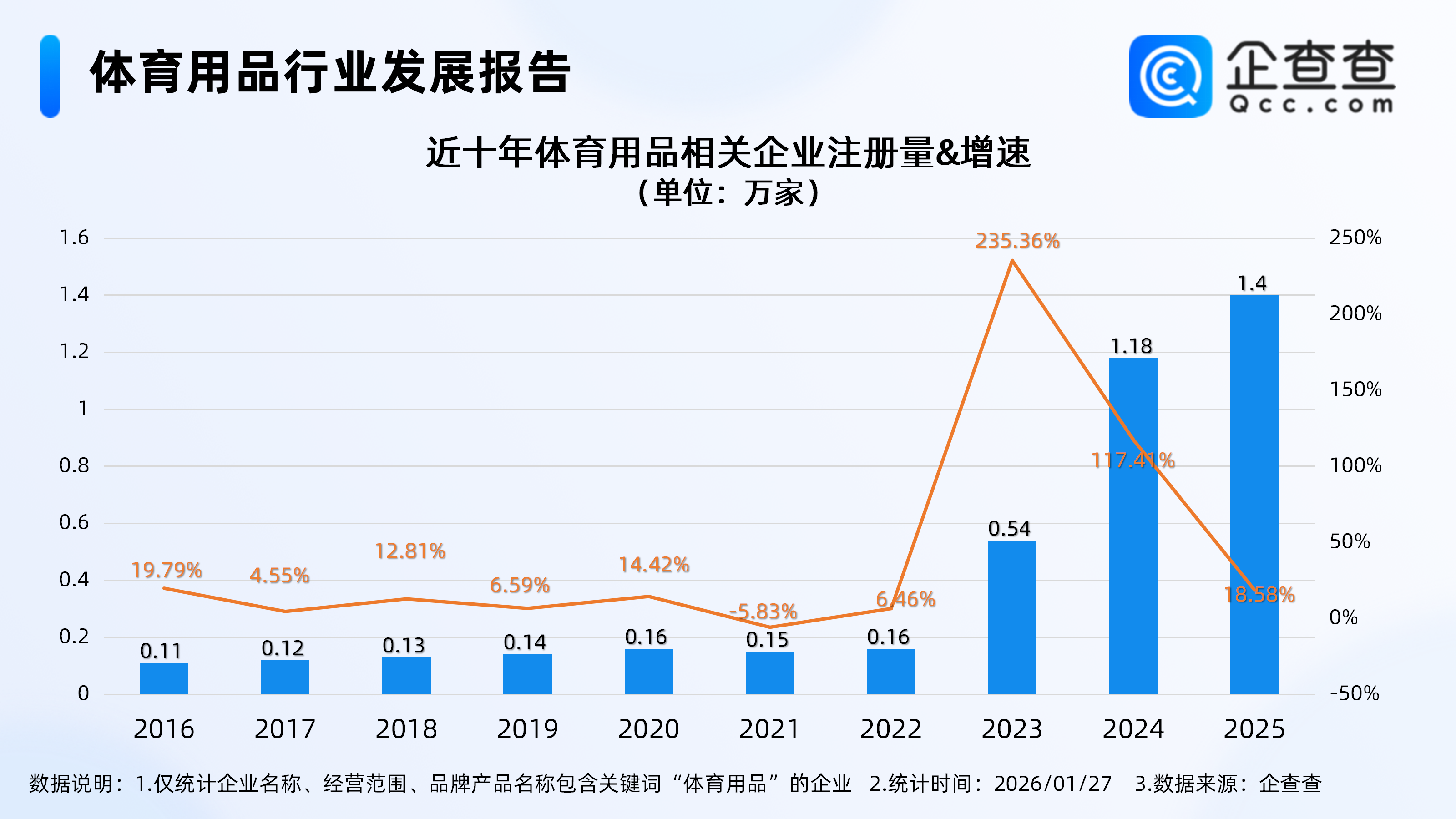 企查查数据显示,截至1月27日,国内现存体育用品相关企业1461.7万家。近十年相关企业注册量呈整体显著增长态势,其中2023年全年注册量猛增235.36%至0.54万家,创近十年注册增速峰值。2024年全年注册量首次突破1万家,同比增长117.41%至1.18万家。2025年延续增势,全年注册量同比增长18.58%至1.4万家,创近十年注册量新高。截至目前,今年已注册712家。