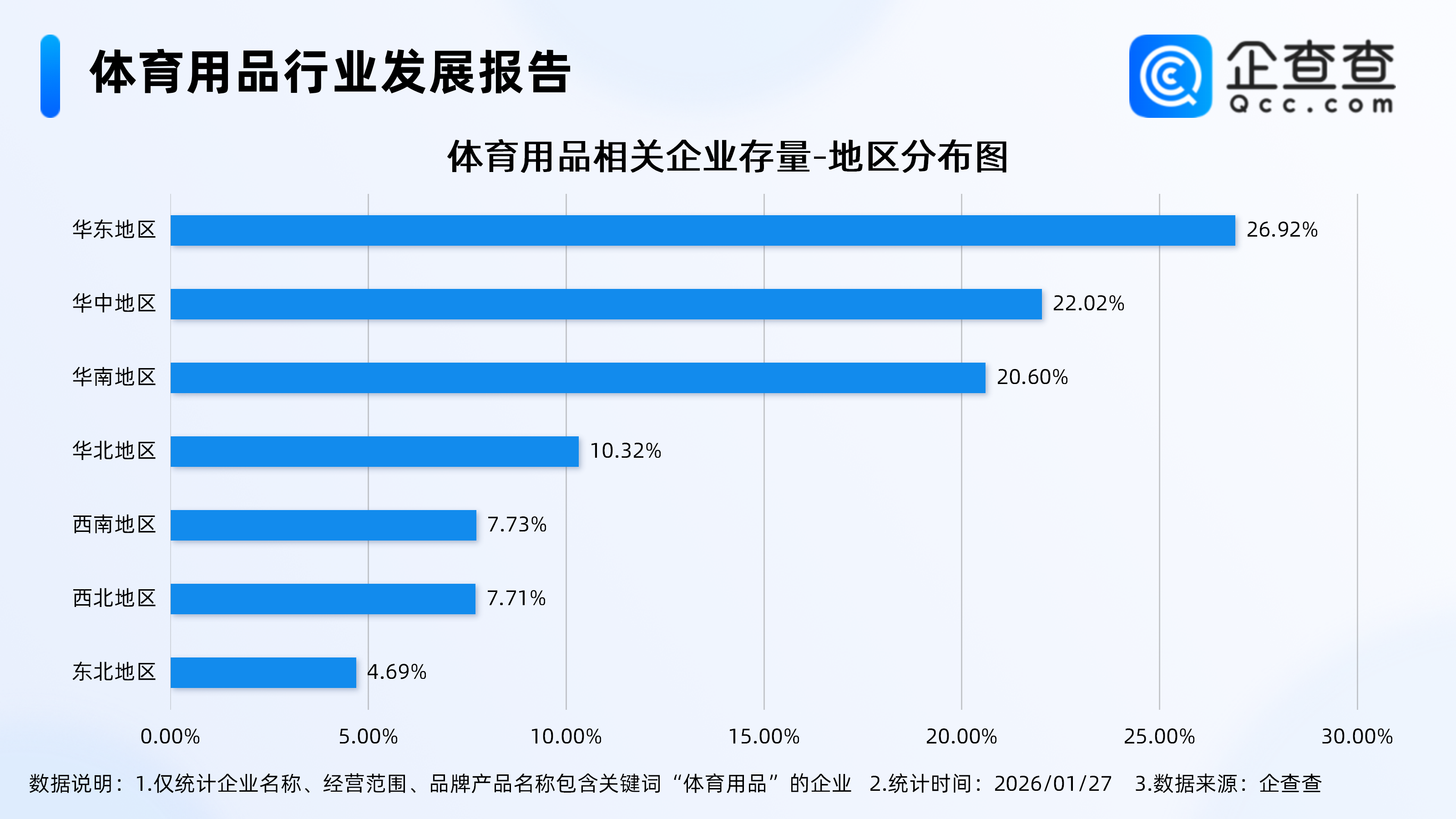 企查查数据显示,从地区分布来看,体育用品相关现存企业多分布在华东地区,占比达26.92%。其次,分布在华中、华南地区的相关企业分别占比22.02%、20.60%。具体来看,隶属浙江省杭州市的义乌市体育用品相关企业占全国相关企业总存量的2.90%,仅次于隶属海南省海口市的龙华区。