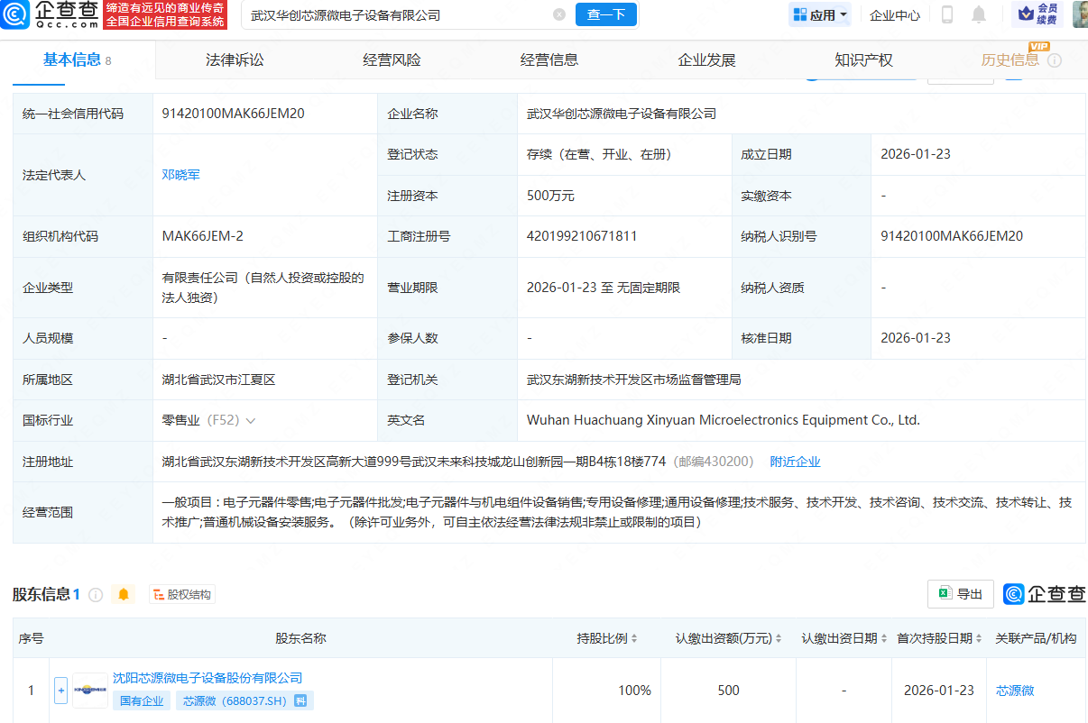 企查查APP显示,近日,武汉华创芯源微电子设备有限公司成立,法定代表人为邓晓军,经营范围包含:电子元器件零售;电子元器件批发;电子元器件与机电组件设备销售;专用设备修理等。企查查股权穿透显示,该公司由芯源微(688037)全资持股。