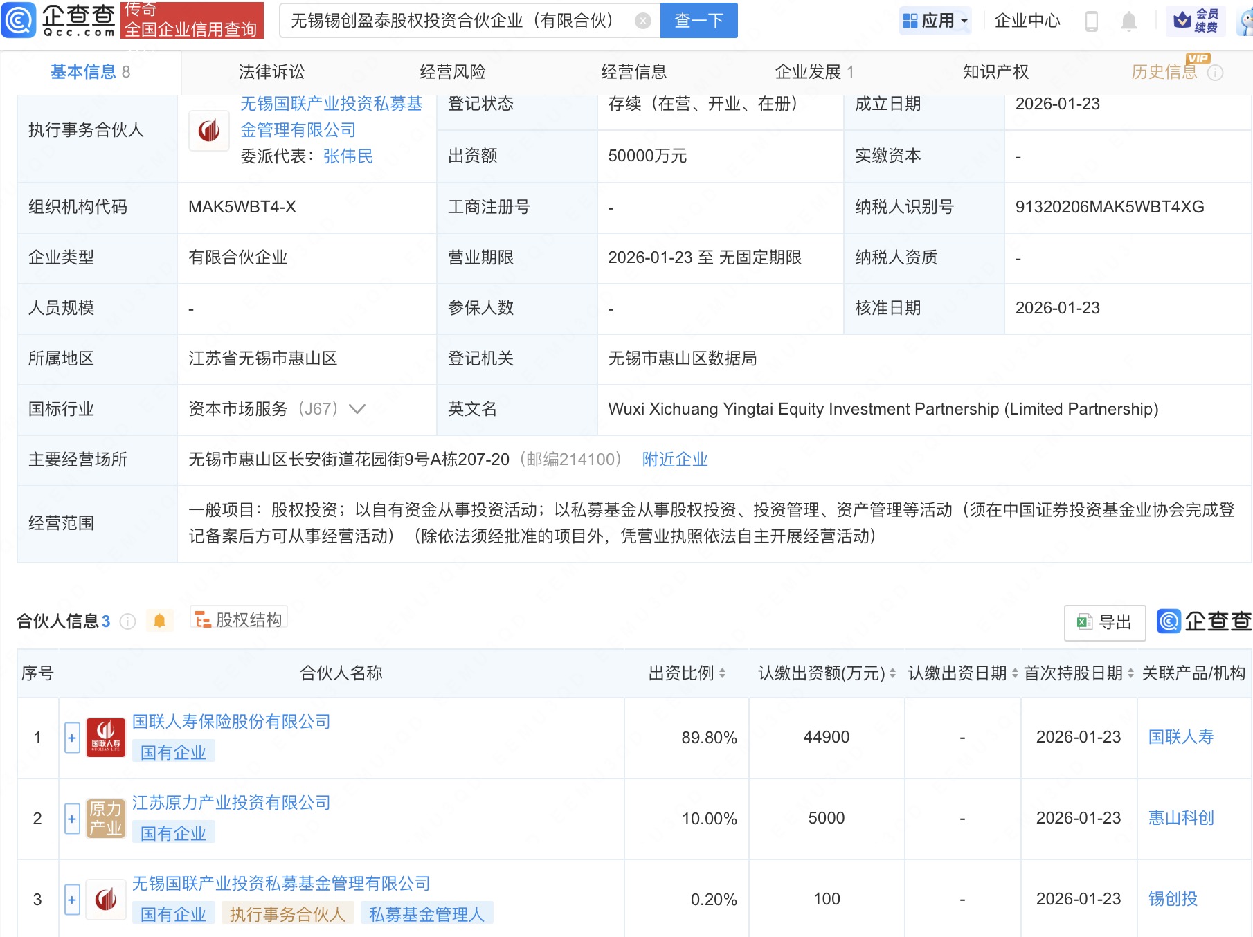 企查查APP显示,近日,无锡锡创盈泰股权投资合伙企业(有限合伙)成立,出资额5亿元,经营范围为股权投资,以自有资金从事投资活动,以私募基金从事股权投资、投资管理、资产管理等活动。企查查股权穿透显示,该企业由国联人寿保险股份有限公司等共同出资。