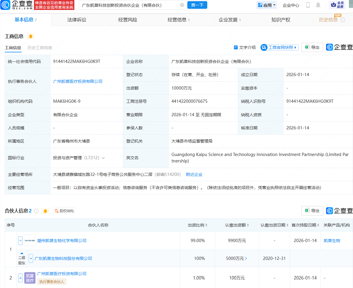 企查查APP显示,近日,广东凯普科技创新投资合伙企业(有限合伙)成立,出资额1亿元,经营范围包含:以自有资金从事投资活动;信息咨询服务。企查查股权穿透显示,该合伙企业由凯普生物(300639)全资子公司潮州凯普生物化学有限公司、广州凯普医疗投资有限公司共同持股。