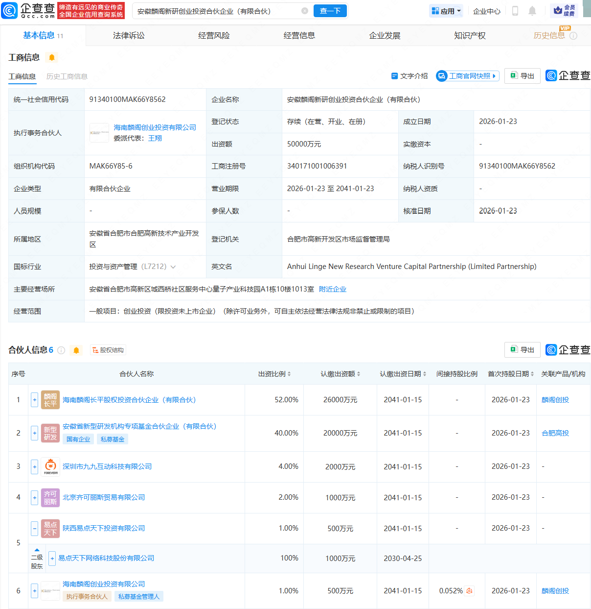 企查查APP显示,近日,安徽麟阁新研创业投资合伙企业(有限合伙)成立,出资额5亿元,经营范围包含:创业投资(限投资未上市企业)。企查查股权穿透显示,该合伙企业由安徽省新型研发机构专项基金合伙企业(有限合伙)、易点天下(301171)全资子公司陕西易点天下投资有限公司等共同持股。