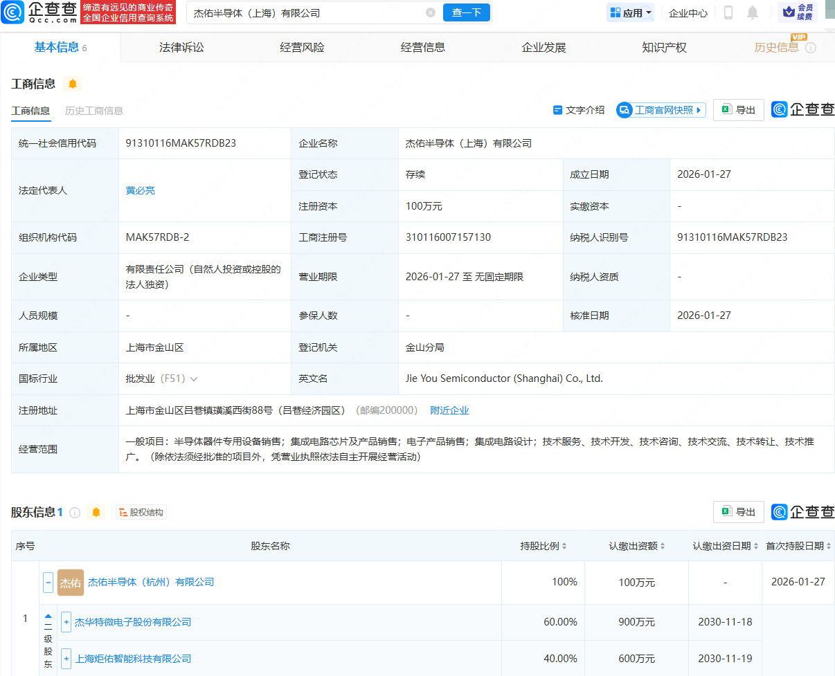企查查APP显示,近日,杰佑半导体(上海)有限公司成立,法定代表人为黄必亮,经营范围包含:半导体器件专用设备销售;集成电路芯片及产品销售;电子产品销售;集成电路设计等。企查查股权穿透显示,该公司由杰佑半导体(杭州)有限公司全资持股,后者由杰华特(688141)、上海炬佑智能科技有限公司共同持股。