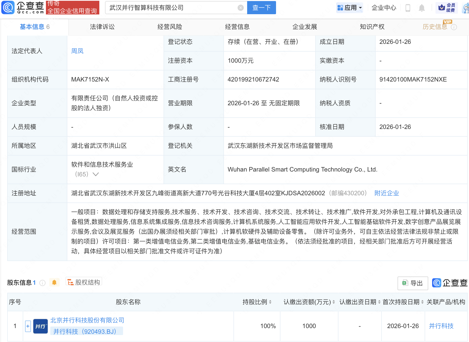 企查查APP显示,近日,武汉并行智算科技有限公司成立,注册资本1000万元,经营范围包含:人工智能应用软件开发;人工智能基础软件开发;数字创意产品展览展示服务等。企查查股权穿透显示,该公司由并行科技(920493)全资持股。