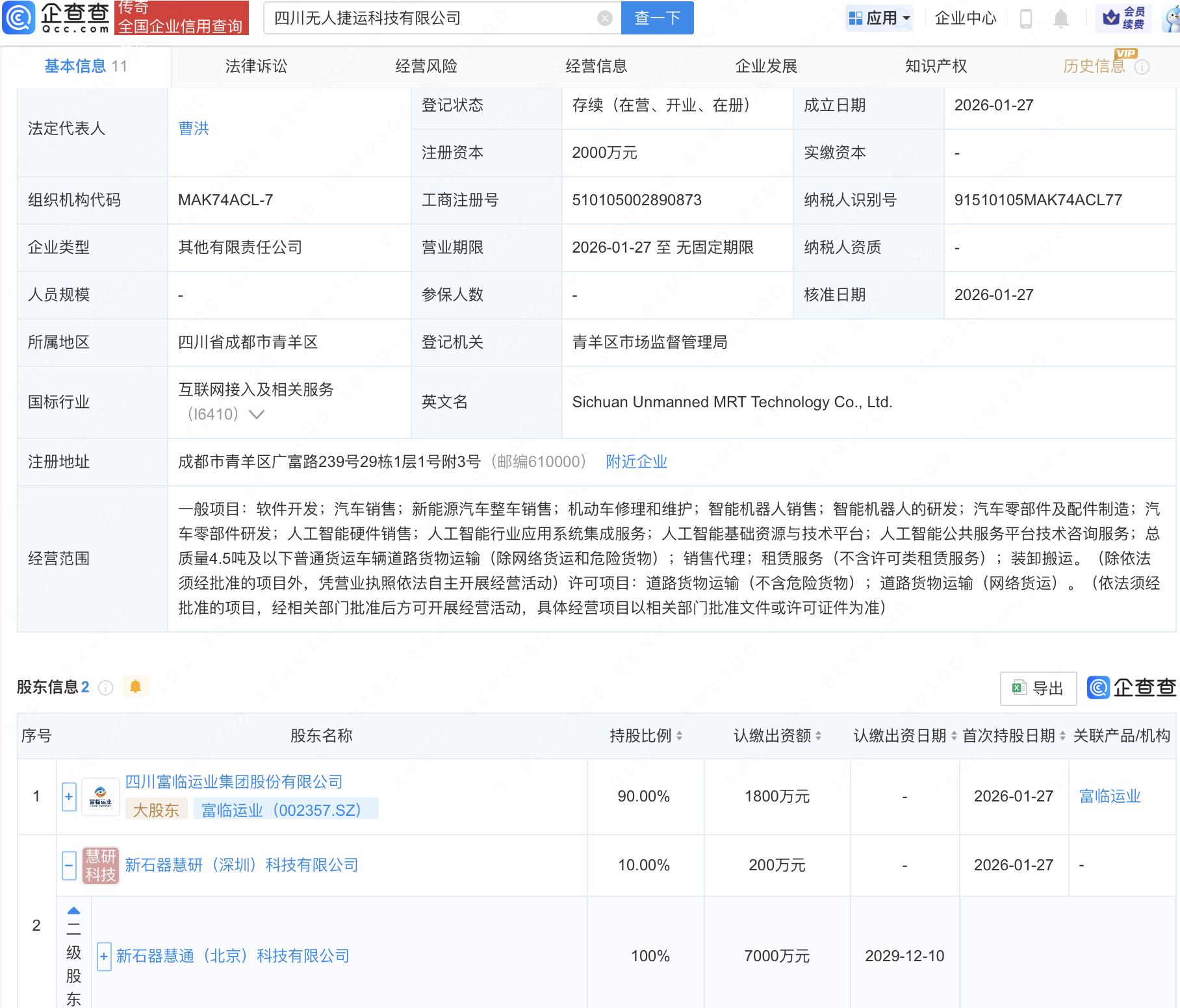 企查查APP显示,近日,四川无人捷运科技有限公司成立,注册资本2000万元,经营范围包含:智能机器人销售;智能机器人的研发;人工智能行业应用系统集成服务;人工智能基础资源与技术平台等。企查查股权穿透显示,该公司由富临运业(002357)、新石器慧通(北京)科技有限公司全资子公司新石器慧研(深圳)科技有限公司共同持股。